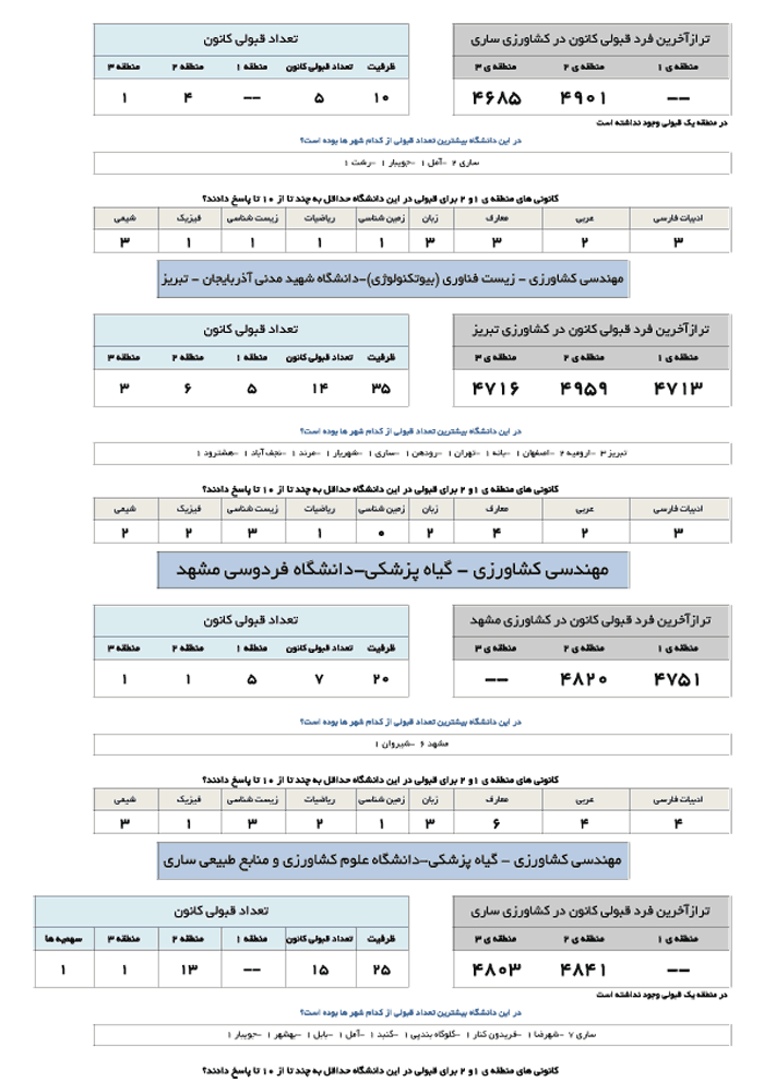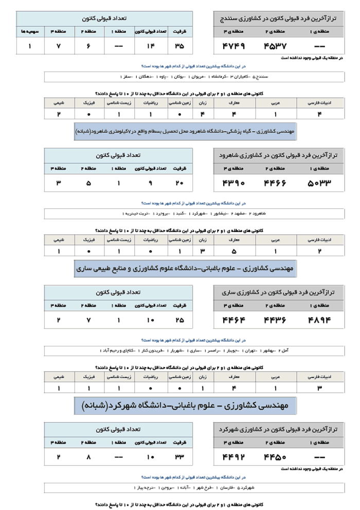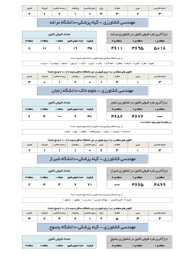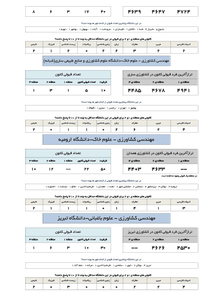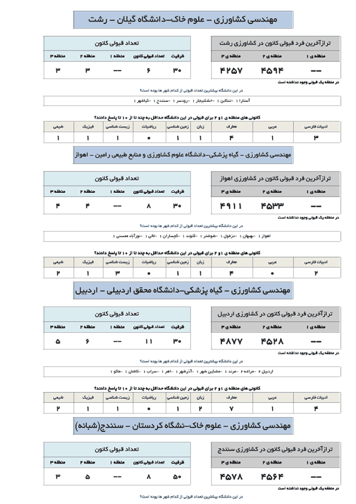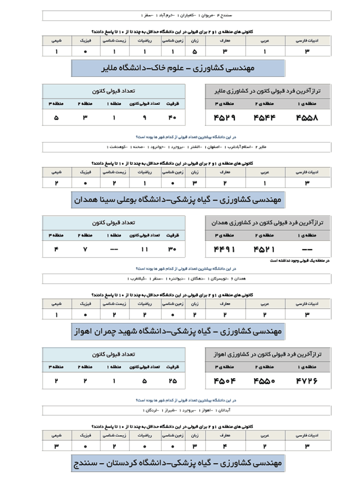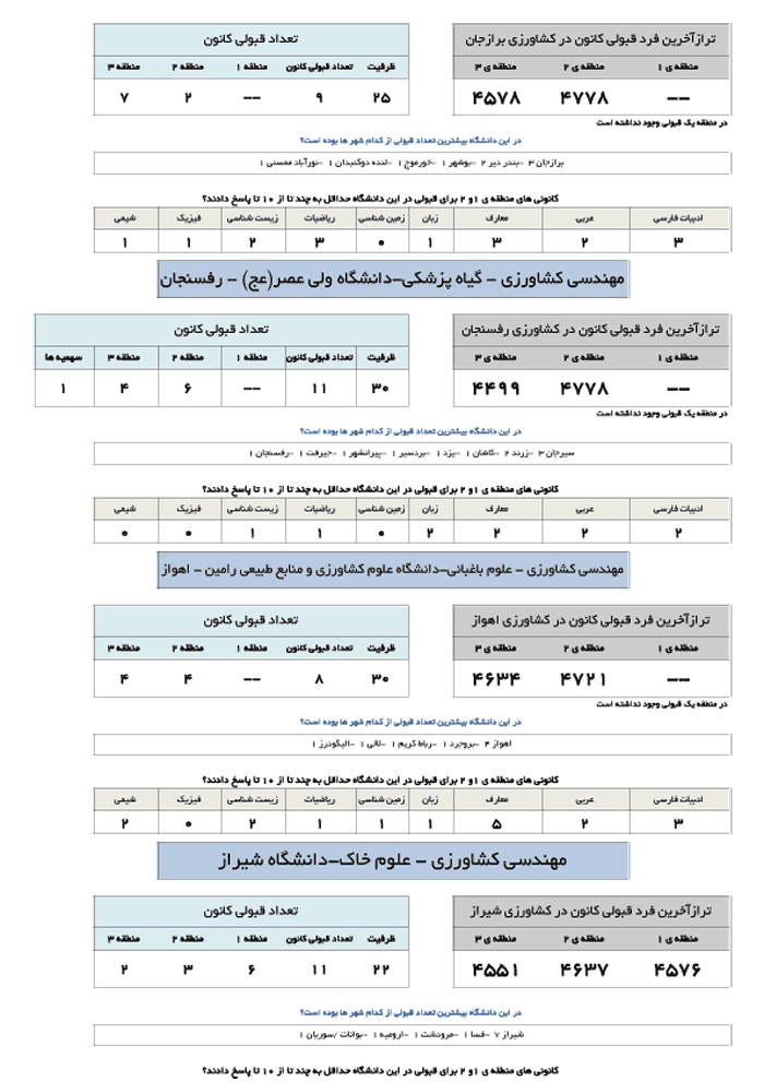 در جدول زیر تراز آخرین فرد قبول شده کانونی در رشته کشاورزی در دانشگاه های مختلف ارائه شده است.
