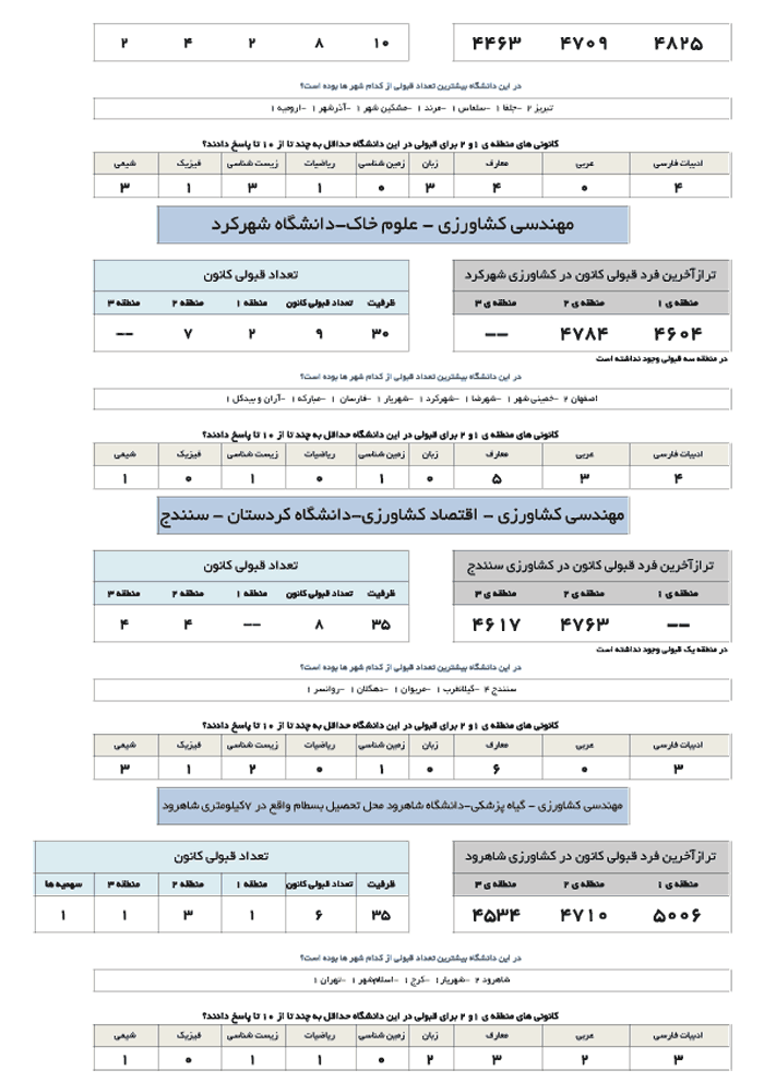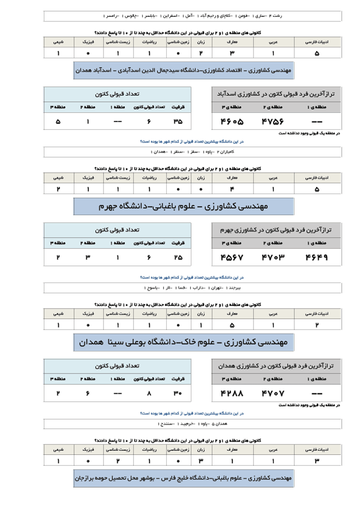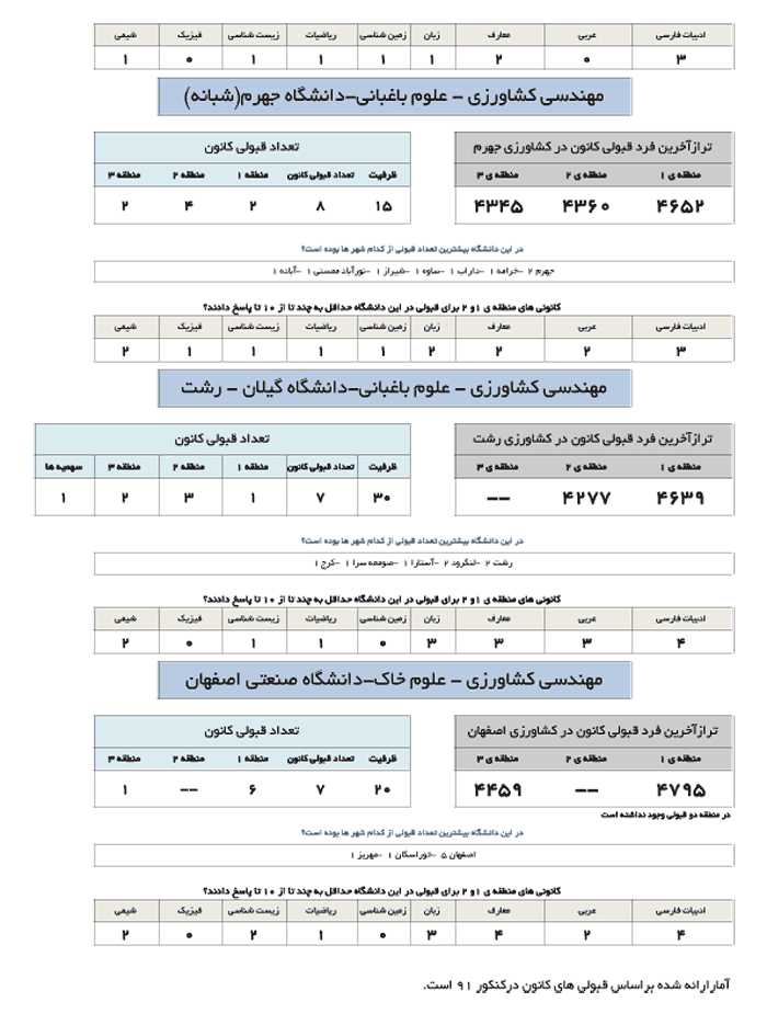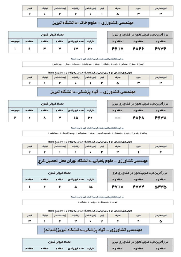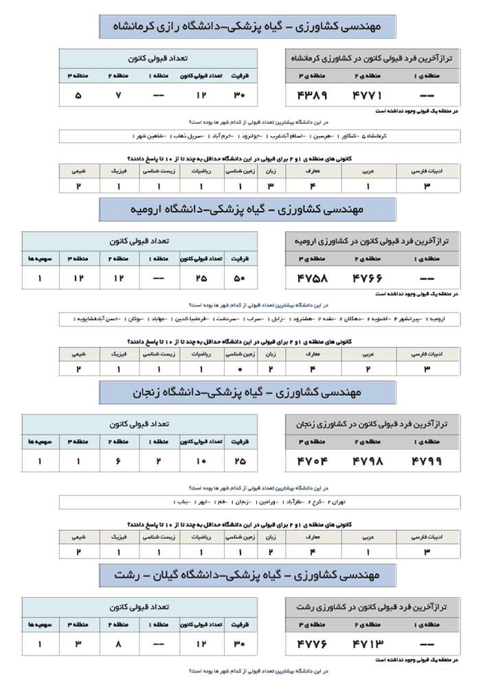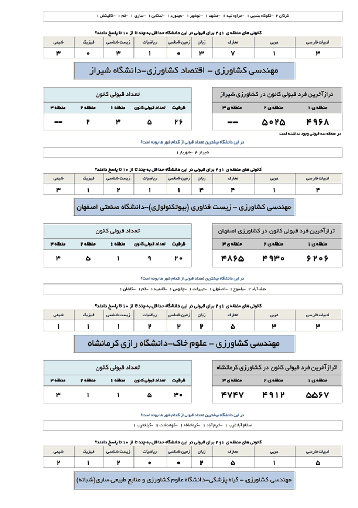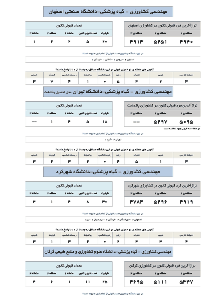 در جدول زیر تراز آخرین فرد قبول شده کانونی در رشته کشاورزی در دانشگاه های مختلف ارائه شده است.