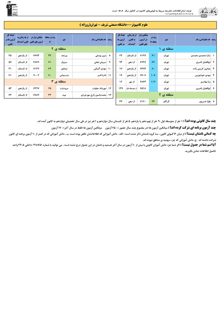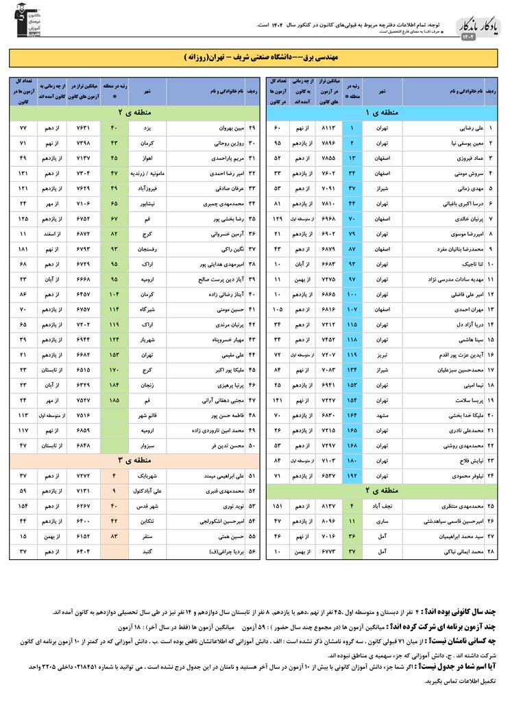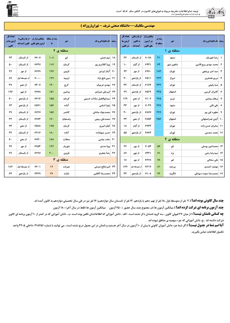 یادگار ماندگار : قبولی های کانونی دانشگاه صنعتی شریف در همه رشته ها در سال 1402 را در ادامه مشاهده کنید.فایل با کیفیت قبولی های سال 1402 را در قسمت فایل های ضمیمه دانلود کنید.