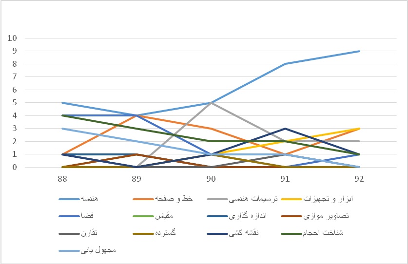 همان طور که انتظار مي رفت روند رو به رشد سوالات هندسه در درس ترسيم ادامه يافت و امسال نزديک به نصف سوالات ترسيم به مبحث هندسه اختصاص داشت.
