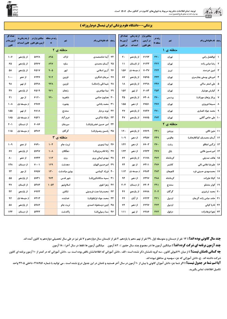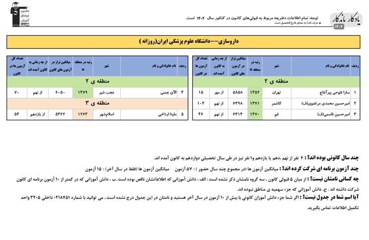 یادگار ماندگار : قبولی های کانونی دانشگاه علوم پزشکی ایران در همه رشته ها در سال 1402 را در ادامه مشاهده کنید.فایل با کیفیت قبولی های سال 1402 را در قسمت فایل های ضمیمه دانلود کنید.