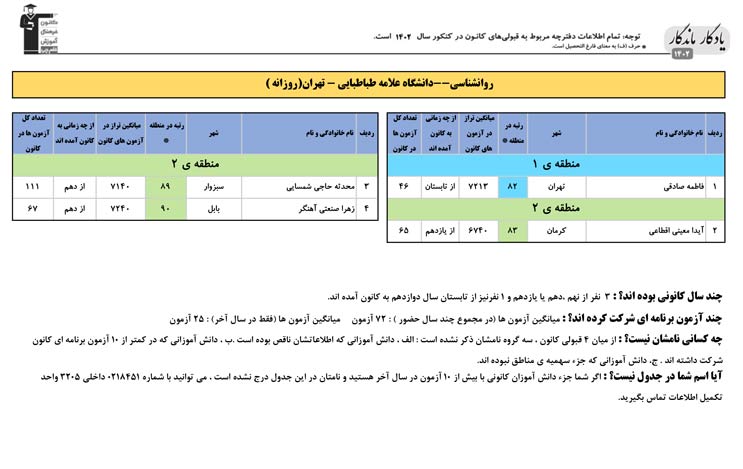 یادگار ماندگار : قبولی های کانونی دانشگاه علامه طباطبایی تهران در همه رشته ها در سال 1402 را در ادامه مشاهده کنید.فایل با کیفیت قبولی های سال 1402 را در قسمت فایل های ضمیمه دانلود کنید.