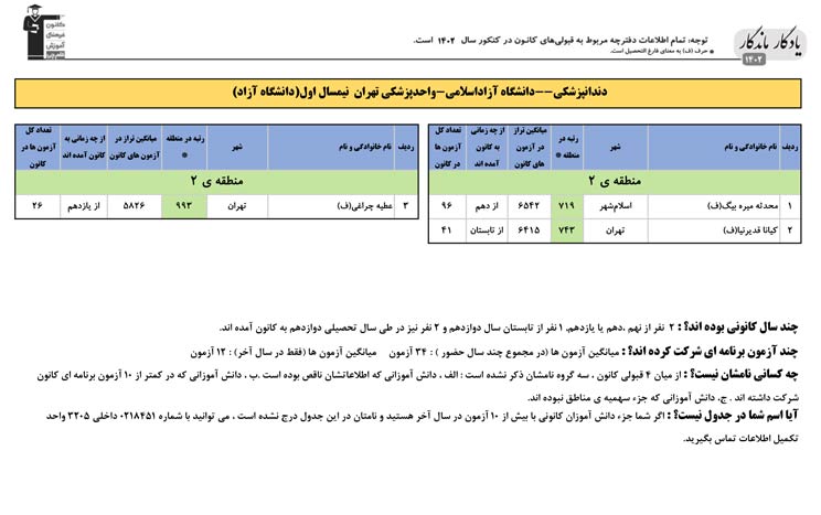 یادگار ماندگار : قبولی های کانونی دانشگاه آزاداسلامي-علوم پزشکي تهران در همه رشته ها در سال 1402 را در ادامه مشاهده کنید.فایل با کیفیت قبولی های سال 1402 را در قسمت فایل های ضمیمه دانلود کنید.