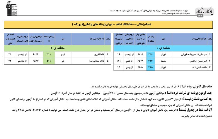 یادگار ماندگار : قبولی های کانونی دانشگاه شاهد در همه رشته ها در سال 1402 را در ادامه مشاهده کنید.فایل با کیفیت قبولی های سال 1402 را در قسمت فایل های ضمیمه دانلود کنید.