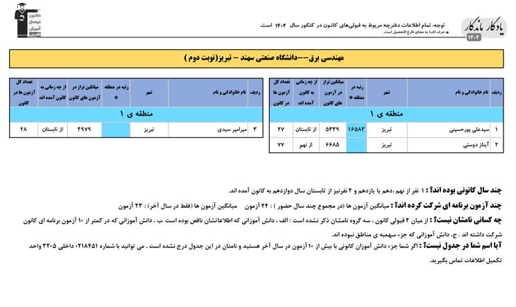یادگار ماندگار : قبولی های کانونی دانشگاه صنعتي سهند تبريز در همه رشته ها در سال 1402 را در ادامه مشاهده کنید.فایل با کیفیت قبولی های سال 1402 را در قسمت فایل های ضمیمه دانلود کنید.