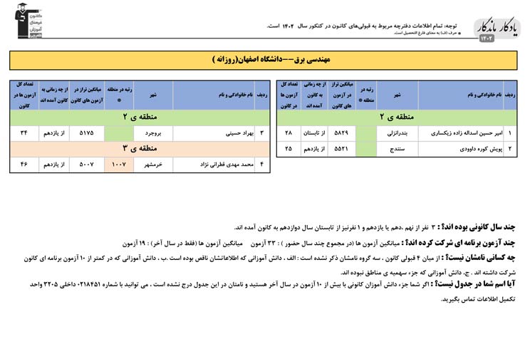 یادگار ماندگار : قبولی های کانونی دانشگاه اصفهان در همه رشته ها در سال 1402 را در ادامه مشاهده کنید.فایل با کیفیت قبولی های سال 1402 را در قسمت فایل های ضمیمه دانلود کنید.