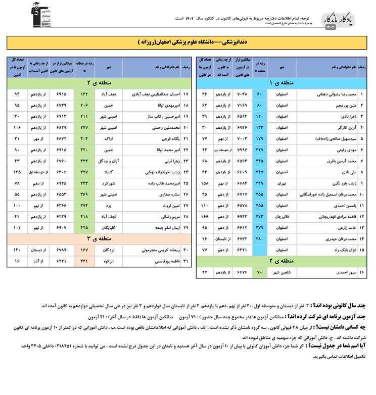 یادگار ماندگار : قبولی های کانونی دانشگاه علوم پزشکی اصفهان در همه رشته ها در سال 1402 را در ادامه مشاهده کنید.فایل با کیفیت قبولی های سال 1402 را در قسمت فایل های ضمیمه دانلود کنید.