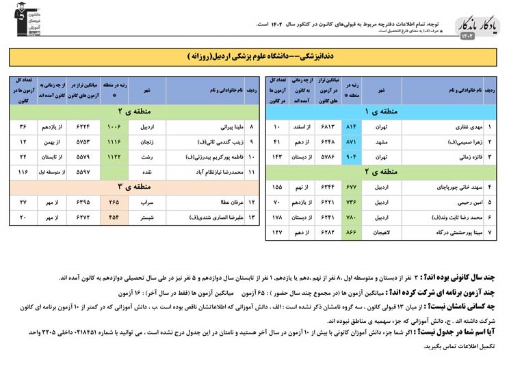 یادگار ماندگار : قبولی های کانونی دانشگاه علوم پزشکی اردبیل در همه رشته ها در سال 1402 را در ادامه مشاهده کنید.فایل با کیفیت قبولی های سال 1402 را در قسمت فایل های ضمیمه دانلود کنید.