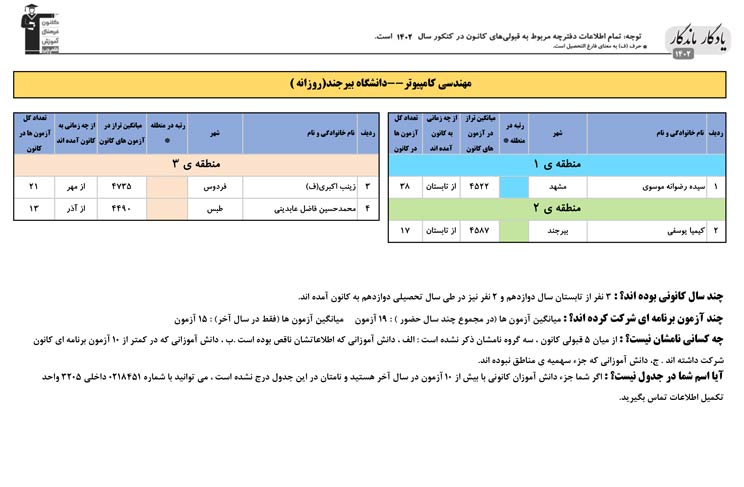 یادگار ماندگار : قبولی های کانونی دانشگاه بيرجند و دانشگاه صنعتی بیرجند در همه رشته ها در سال 1402 را در ادامه مشاهده کنید.فایل با کیفیت قبولی های سال 1402 را در قسمت فایل های ضمیمه دانلود کنید.