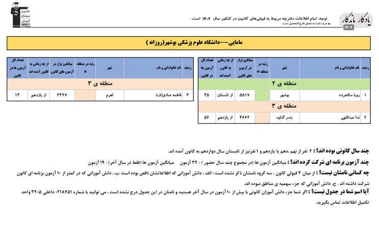یادگار ماندگار : قبولی های کانونی دانشگاه علوم پزشکی بوشهر در همه رشته ها در سال 1402 را در ادامه مشاهده کنید.فایل با کیفیت قبولی های سال 1402 را در قسمت فایل های ضمیمه دانلود کنید.