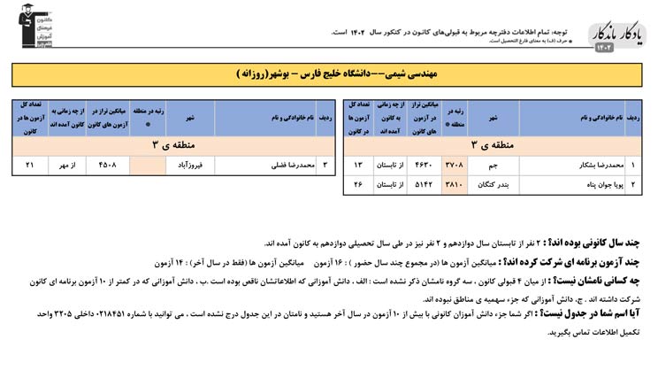 یادگار ماندگار : قبولی های کانونی دانشگاه خلیج فارس - بوشهر در همه رشته ها در سال 1402 را در ادامه مشاهده کنید.فایل با کیفیت قبولی های سال 1402 را در قسمت فایل های ضمیمه دانلود کنید.