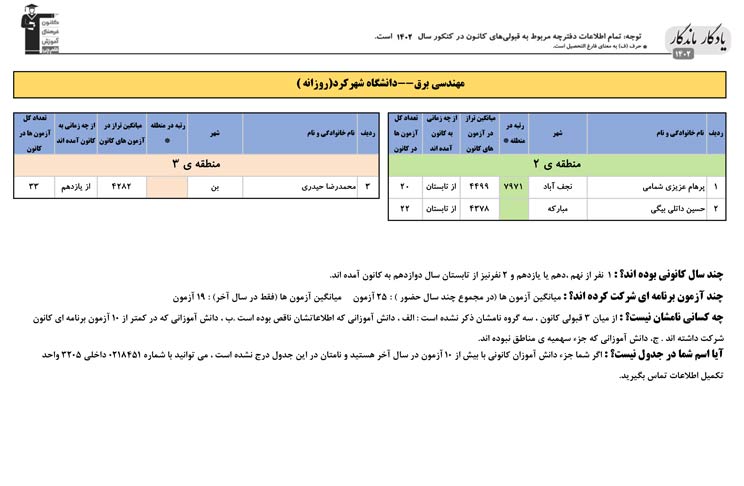 یادگار ماندگار : قبولی های کانونی دانشگاه شهرکرد در همه رشته ها در سال 1402 را در ادامه مشاهده کنید.فایل با کیفیت قبولی های سال 1402 را در قسمت فایل های ضمیمه دانلود کنید.