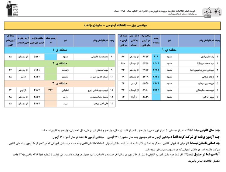 یادگار ماندگار : قبولی های کانونی دانشگاه فردوسی مشهد در همه رشته ها در سال 1402 را در ادامه مشاهده کنید.فایل با کیفیت قبولی های سال 1402 را در قسمت فایل های ضمیمه دانلود کنید.