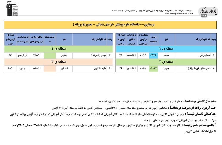 یادگار ماندگار : قبولی های کانونی دانشگاه علوم پزشکي خراسان شمالي - بجنورد در همه رشته ها در سال 1402 را در ادامه مشاهده کنید.فایل با کیفیت قبولی های سال 1402 را در قسمت فایل های ضمیمه دانلود کنید.