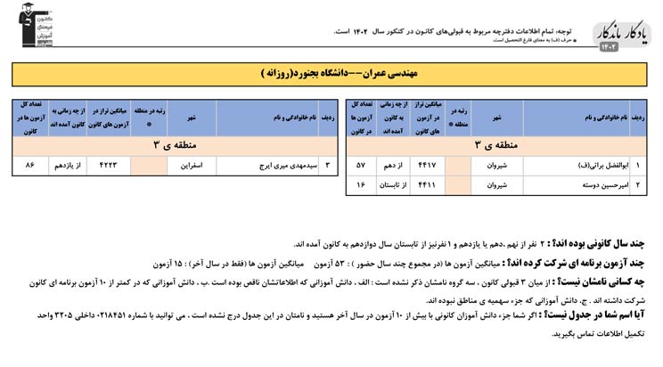 یادگار ماندگار : قبولی های کانونی دانشگاه بجنورد در همه رشته ها در سال 1402 را در ادامه مشاهده کنید.فایل با کیفیت قبولی های سال 1402 را در قسمت فایل های ضمیمه دانلود کنید.