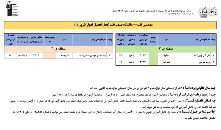 یادگار ماندگار : قبولی های کانونی دانشگاه صنعت نفت در همه رشته ها در سال 1402 را در ادامه مشاهده کنید.فایل با کیفیت قبولی های سال 1402 را در قسمت فایل های ضمیمه دانلود کنید.