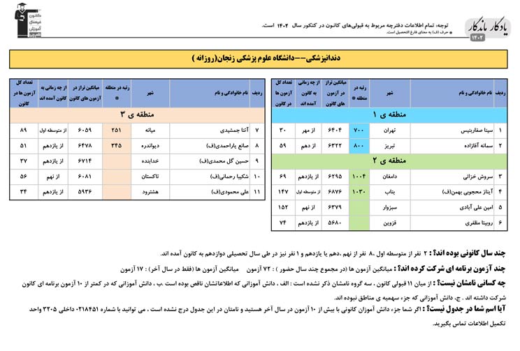 یادگار ماندگار : قبولی های کانونی دانشگاه علوم پزشکی زنجان در همه رشته ها در سال 1402 را در ادامه مشاهده کنید.فایل با کیفیت قبولی های سال 1402 را در قسمت فایل های ضمیمه دانلود کنید.