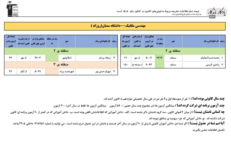 یادگار ماندگار : قبولی های کانونی دانشگاه سمنان در همه رشته ها در سال 1402 را در ادامه مشاهده کنید.فایل با کیفیت قبولی های سال 1402 را در قسمت فایل های ضمیمه دانلود کنید.
