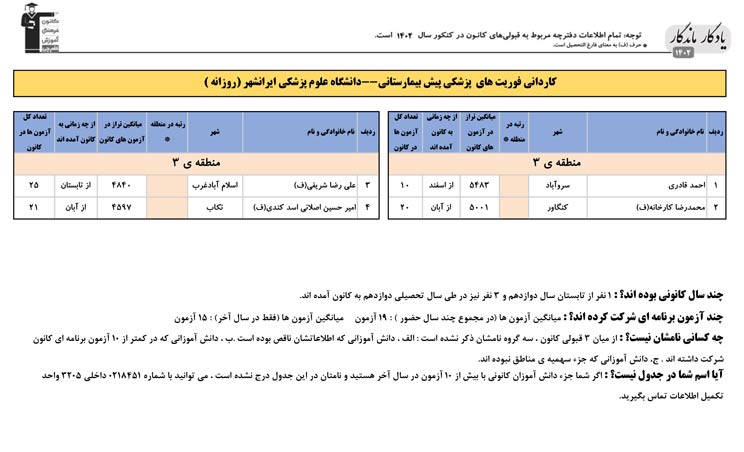یادگار ماندگار : قبولی های کانونی دانشگاه علوم پزشکي ايرانشهر در همه رشته ها در سال 1402 را در ادامه مشاهده کنید.فایل با کیفیت قبولی های سال 1402 را در قسمت فایل های ضمیمه دانلود کنید.