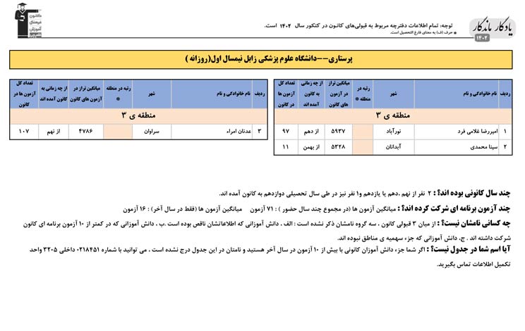 یادگار ماندگار : قبولی های کانونی دانشگاه علوم پزشکی زابل در همه رشته ها در سال 1402 را در ادامه مشاهده کنید.فایل با کیفیت قبولی های سال 1402 را در قسمت فایل های ضمیمه دانلود کنید.