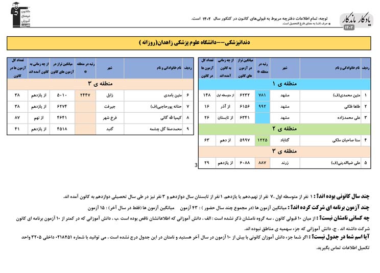 یادگار ماندگار : قبولی های کانونی دانشگاه علوم پزشکی زاهدان در همه رشته ها در سال 1402 را در ادامه مشاهده کنید.فایل با کیفیت قبولی های سال 1402 را در قسمت فایل های ضمیمه دانلود کنید.