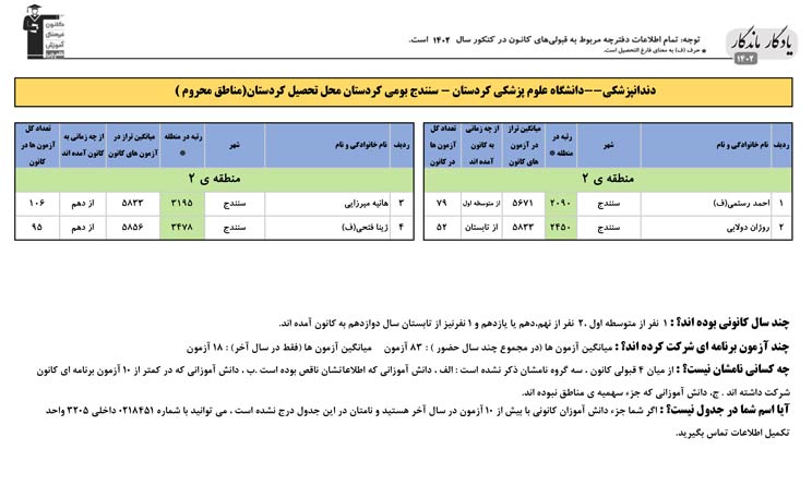 یادگار ماندگار : قبولی های کانونی دانشگاه علوم پزشکي سنندج در همه رشته ها در سال 1402 را در ادامه مشاهده کنید.فایل با کیفیت قبولی های سال 1402 را در قسمت فایل های ضمیمه دانلود کنید.