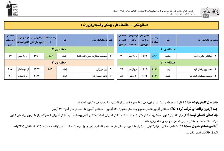 یادگار ماندگار : قبولی های کانونی دانشگاه علوم پزشکی رفسنجان در همه رشته ها در سال 1402 را در ادامه مشاهده کنید.فایل با کیفیت قبولی های سال 1402 را در قسمت فایل های ضمیمه دانلود کنید.