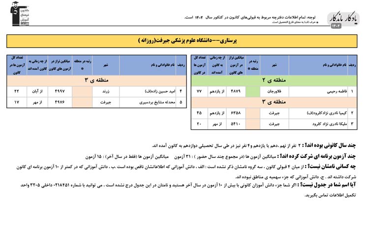 یادگار ماندگار : قبولی های کانونی دانشگاه علوم پزشکی جیرفت در همه رشته ها در سال 1402 را در ادامه مشاهده کنید.فایل با کیفیت قبولی های سال 1402 را در قسمت فایل های ضمیمه دانلود کنید.