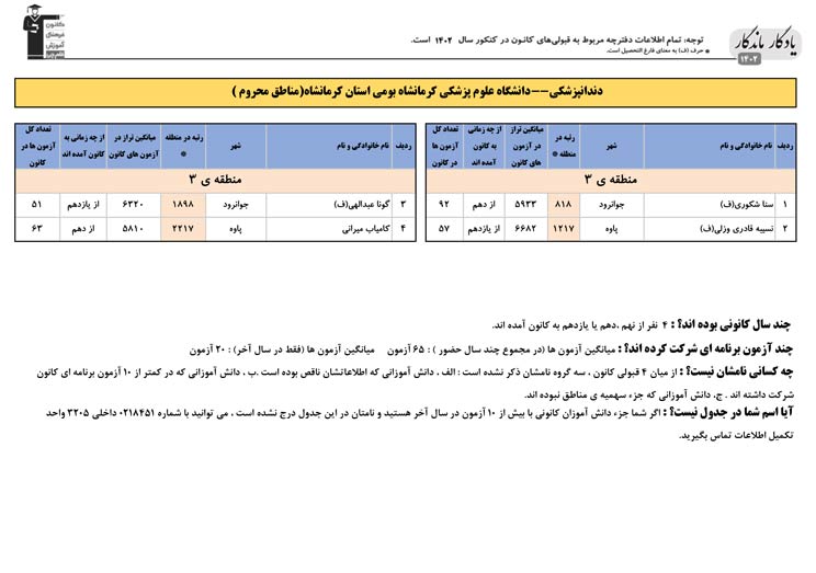یادگار ماندگار : قبولی های کانونی دانشگاه علوم پزشکی کرمانشاه در همه رشته ها در سال 1402 را در ادامه مشاهده کنید.فایل با کیفیت قبولی های سال 1402 را در قسمت فایل های ضمیمه دانلود کنید.