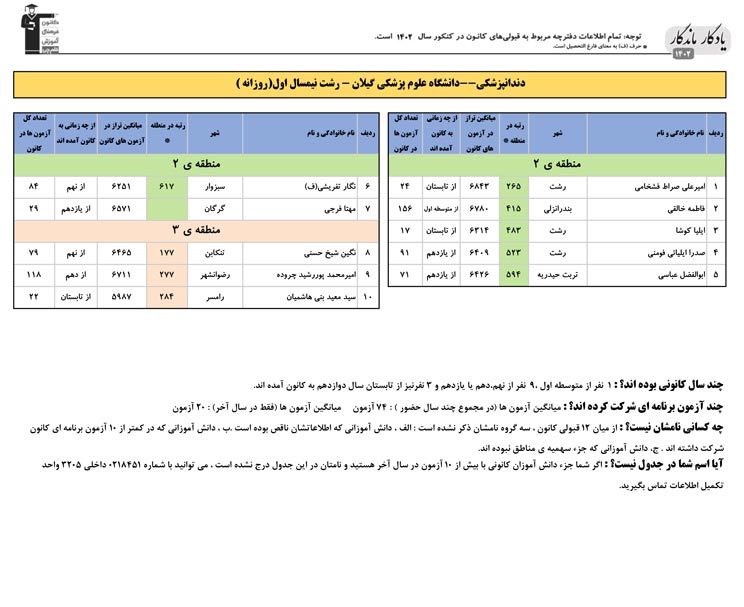 یادگار ماندگار : قبولی های کانونی دانشگاه علوم پزشکي رشت در همه رشته ها در سال 1402 را در ادامه مشاهده کنید.فایل با کیفیت قبولی های سال 1402 را در قسمت فایل های ضمیمه دانلود کنید.