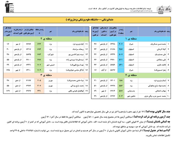 یادگار ماندگار : قبولی های کانونی دانشگاه علوم پزشکی یزد در همه رشته ها در سال 1402 را در ادامه مشاهده کنید.فایل با کیفیت قبولی های سال 1402 را در قسمت فایل های ضمیمه دانلود کنید.