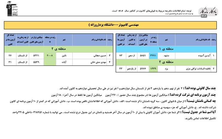 یادگار ماندگار : قبولی های کانونی دانشگاه یزد در همه رشته ها در سال 1402 را در ادامه مشاهده کنید.فایل با کیفیت قبولی های سال 1402 را در قسمت فایل های ضمیمه دانلود کنید.