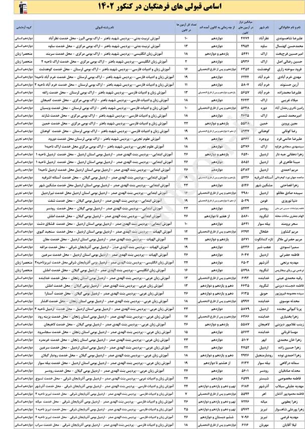 یادگار ماندگار 1402 : قبولی های کانونی دانشگاه های فرهنگیان در همه رشته ها در سال 1402 را در جدول زیر مشاهده کنید.فایل با کیفیت قبولی های سال 1402 را در قسمت فایل های ضمیمه دانلود کنید.