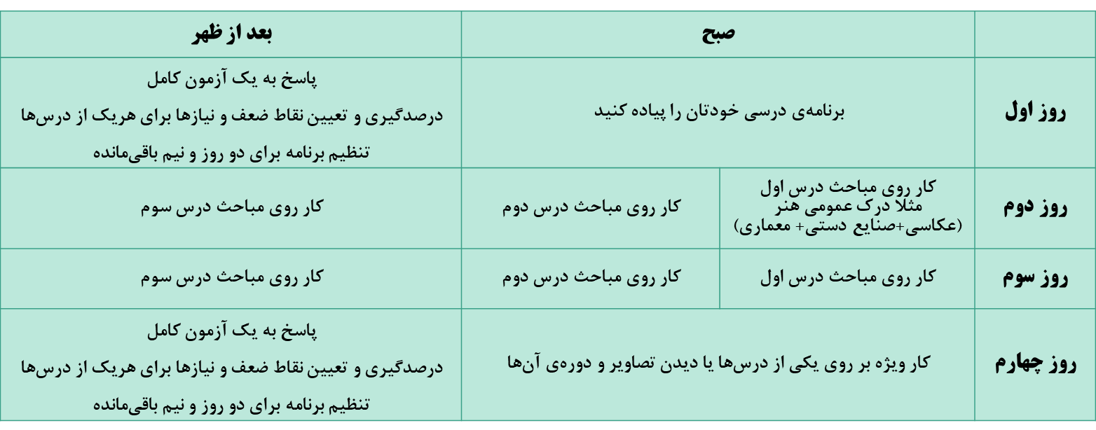 (جدول زیر نمونهای از برنامه سه روزیکبار هنر)