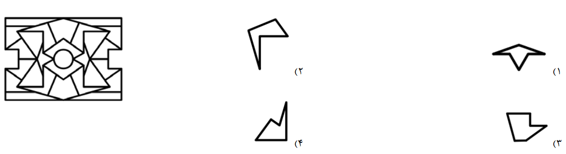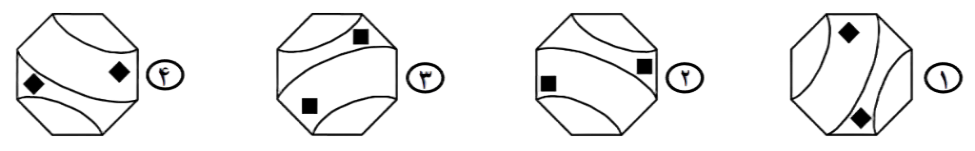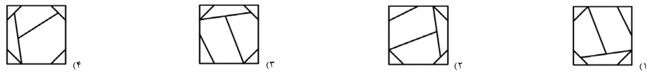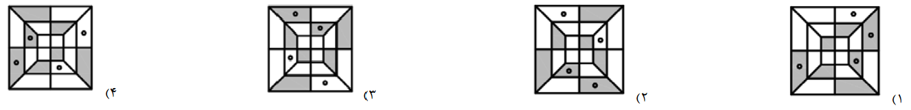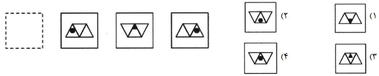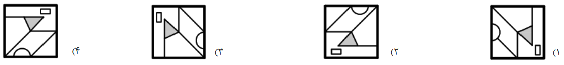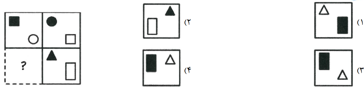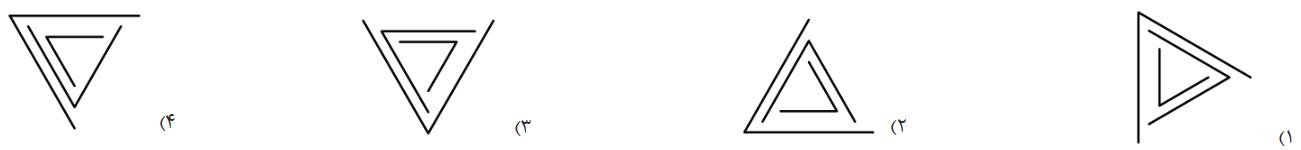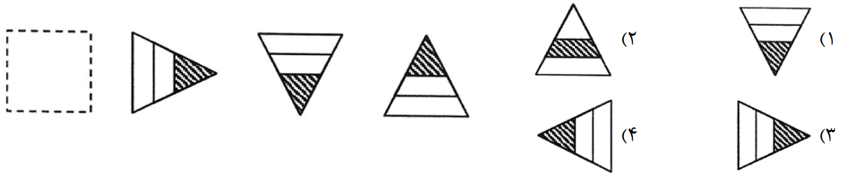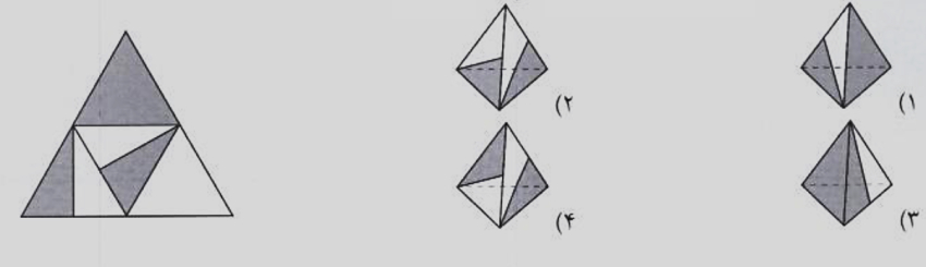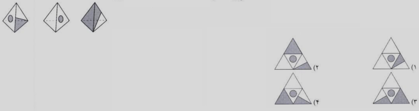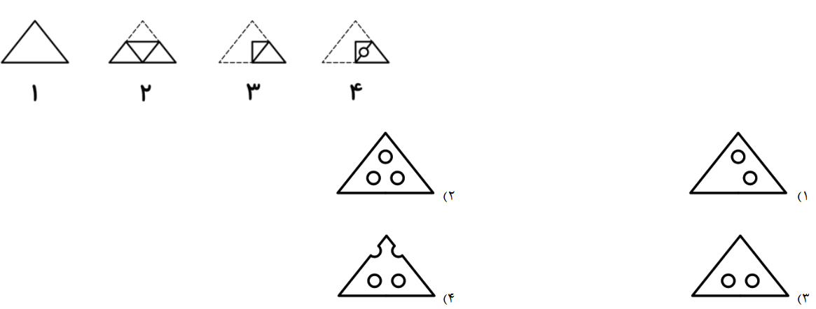 پاسخ تشریحی: گزینه 1- می توان چهار مثلث کوچک را کنار هم قرار داد، در این صورت نوک تیز مثلث های بزرگ رنگی به سمت بیرون است( حذف گزینههای 2 و 3) و طبق قانون L (حذف گزینه 4).