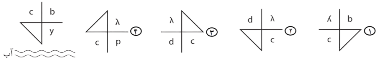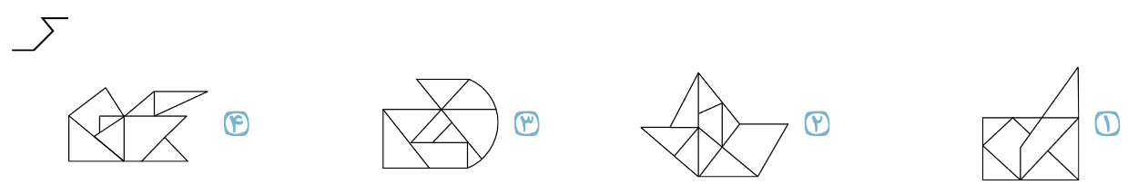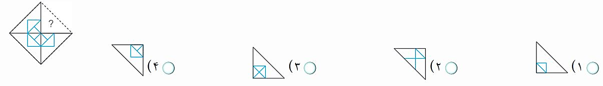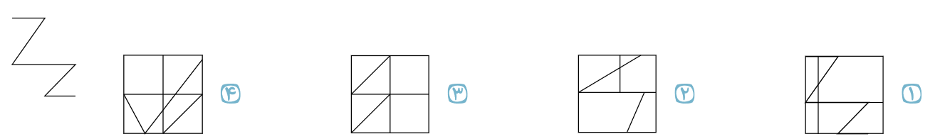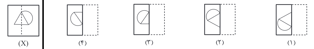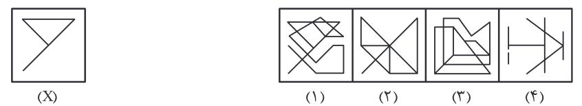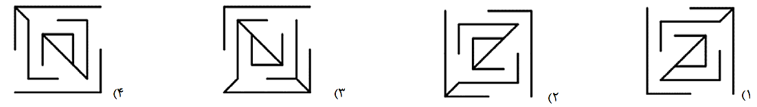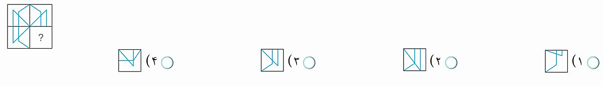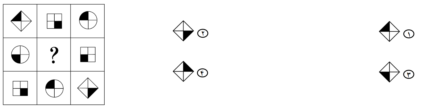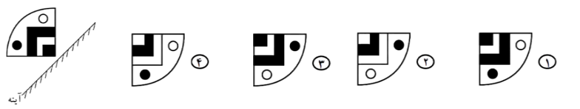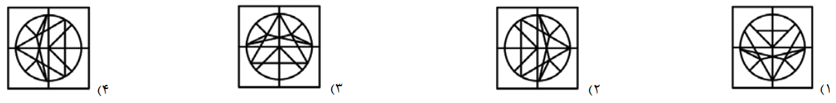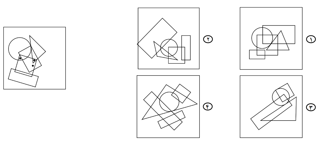 پاسخ تشریحی: گزینه 1- می توان چهار مثلث کوچک را کنار هم قرار داد، در این صورت نوک تیز مثلث های بزرگ رنگی به سمت بیرون است( حذف گزینههای 2 و 3) و طبق قانون L (حذف گزینه 4).