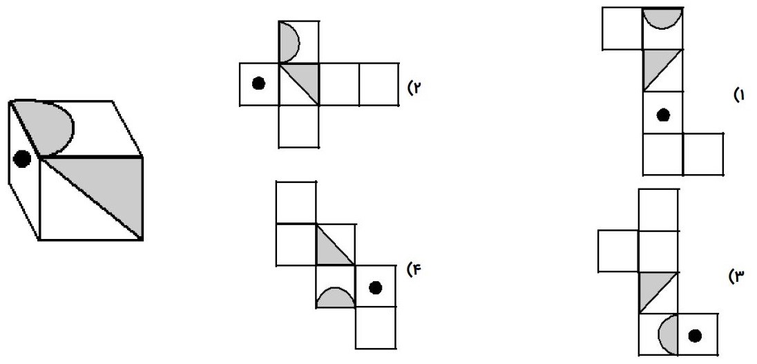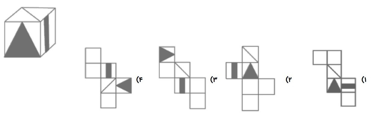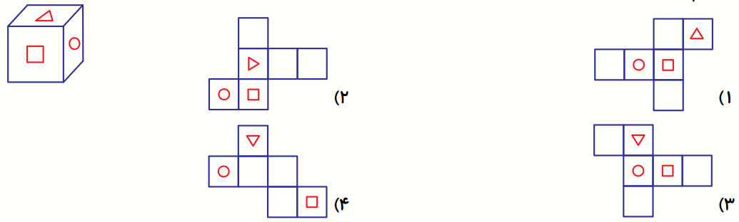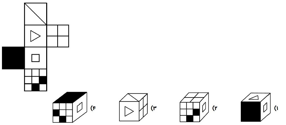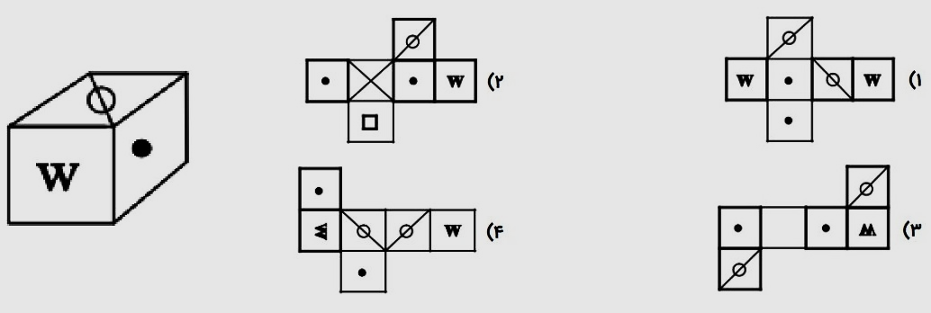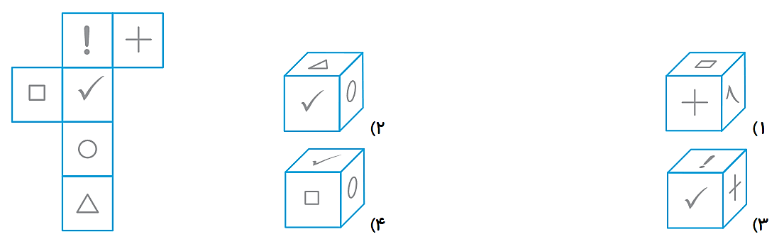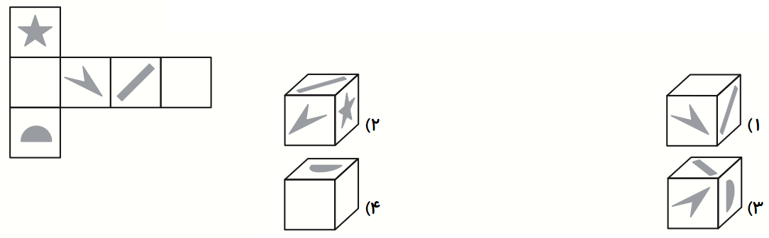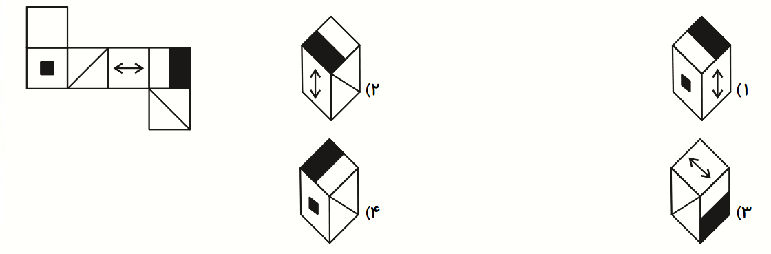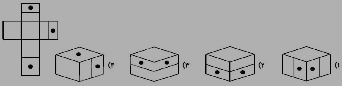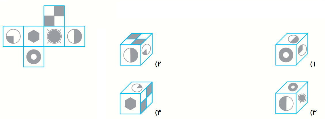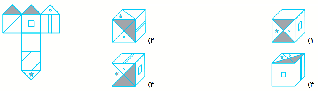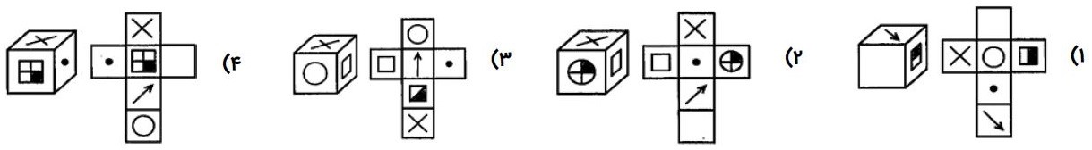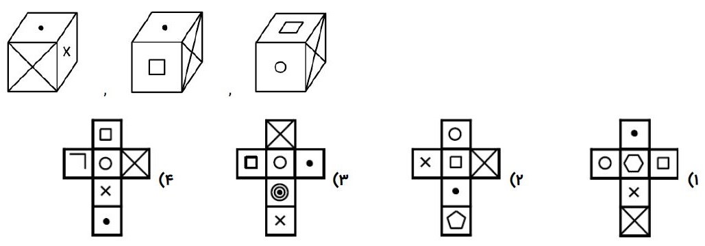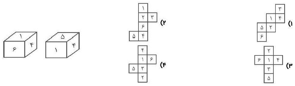 پاسخ تشریحی: گزینه 4- وجه های یک و چهار روبه روی هم(حذف گزینه1) و وجه های سه و شش روبه روی هم(حذف گزینه 2) و وجه های دو و پنج رو به روی هم( حذف گزینه 3) هسند.