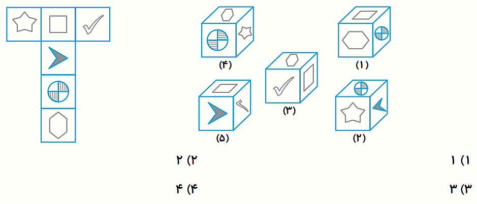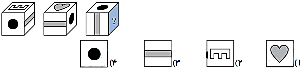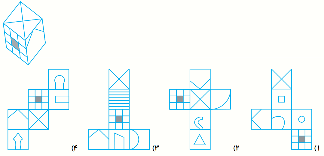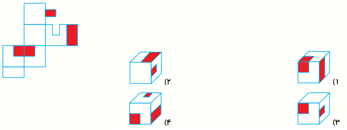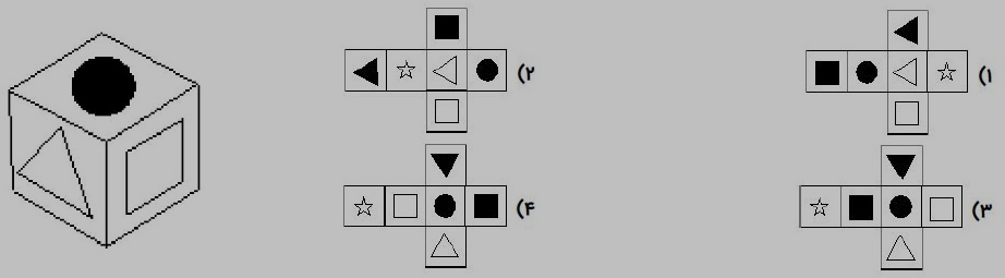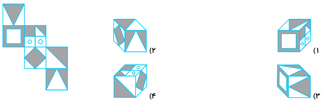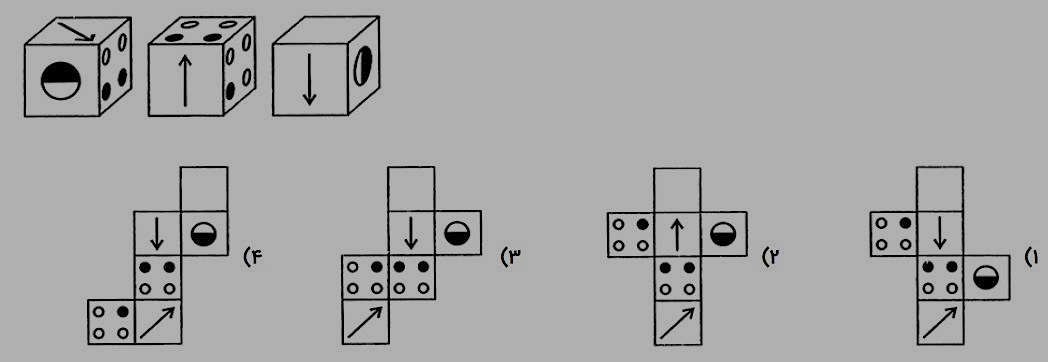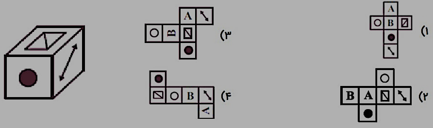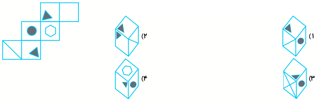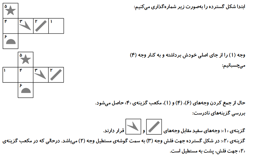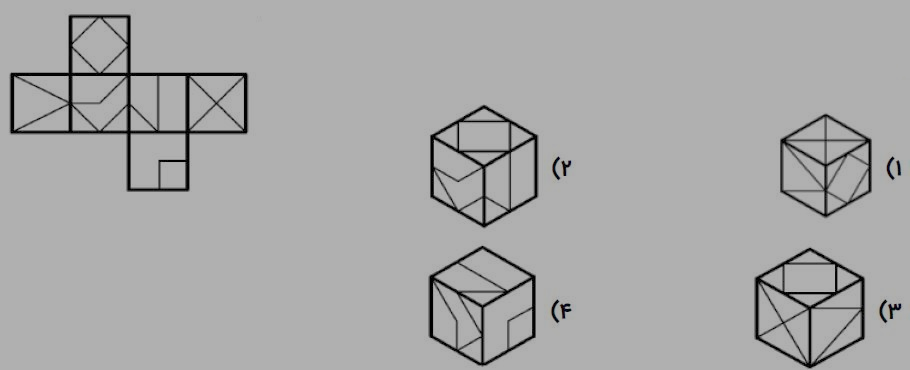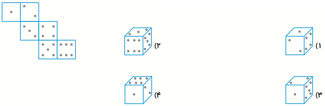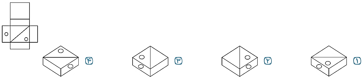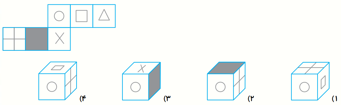 پاسخ تشریحی: گزینه 4- وجه های یک و چهار روبه روی هم(حذف گزینه1) و وجه های سه و شش روبه روی هم(حذف گزینه 2) و وجه های دو و پنج رو به روی هم( حذف گزینه 3) هسند.