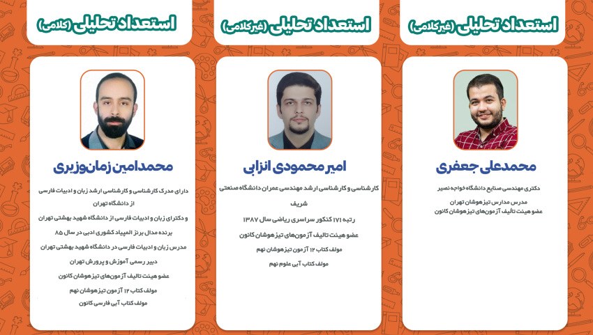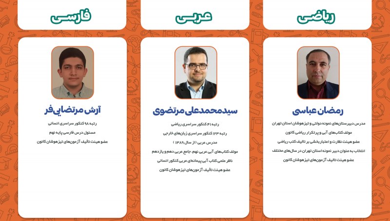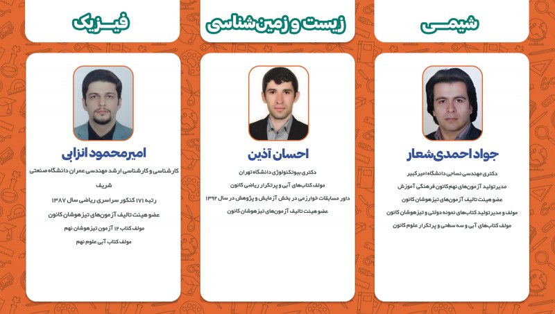 اساتید این کلاسها همگی از همکاران باتجربه و با توان علمی بالا در گروه علمی پایه نهم کانون هستند. اسامی دبیران و سابقه کاری ایشان مطابق جدول زیر است: