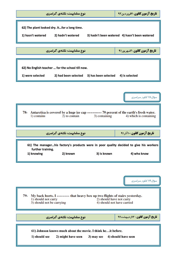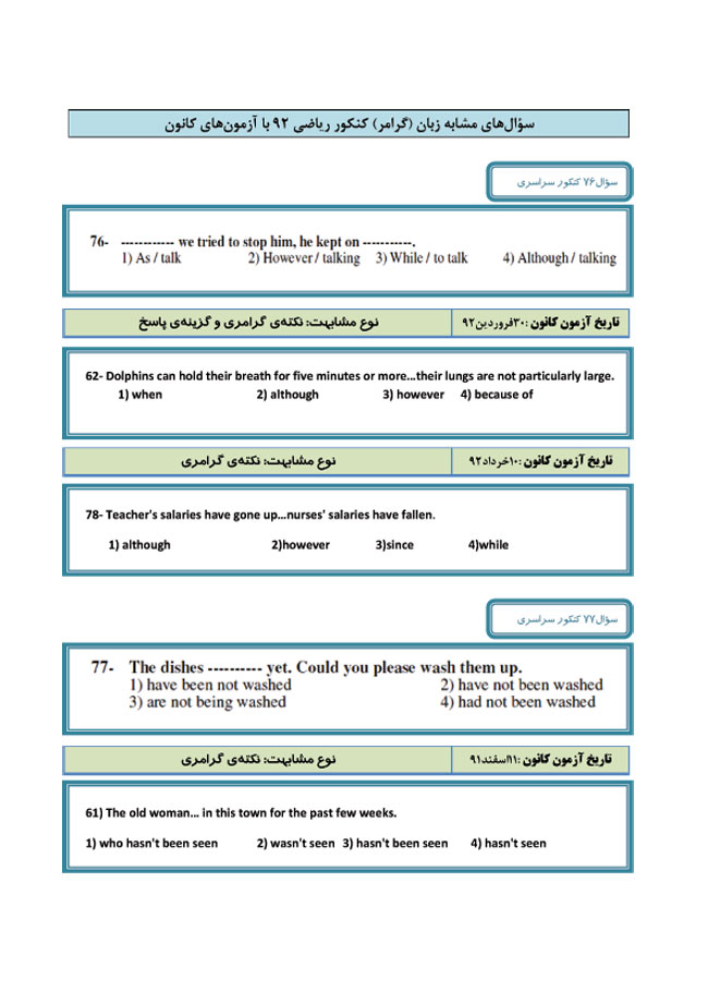 مشابهت سؤالات زبان (گرامر) کنکور ریاضی92 با آزمونهای کانون