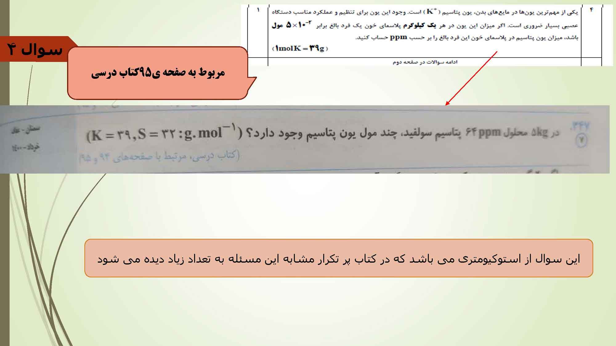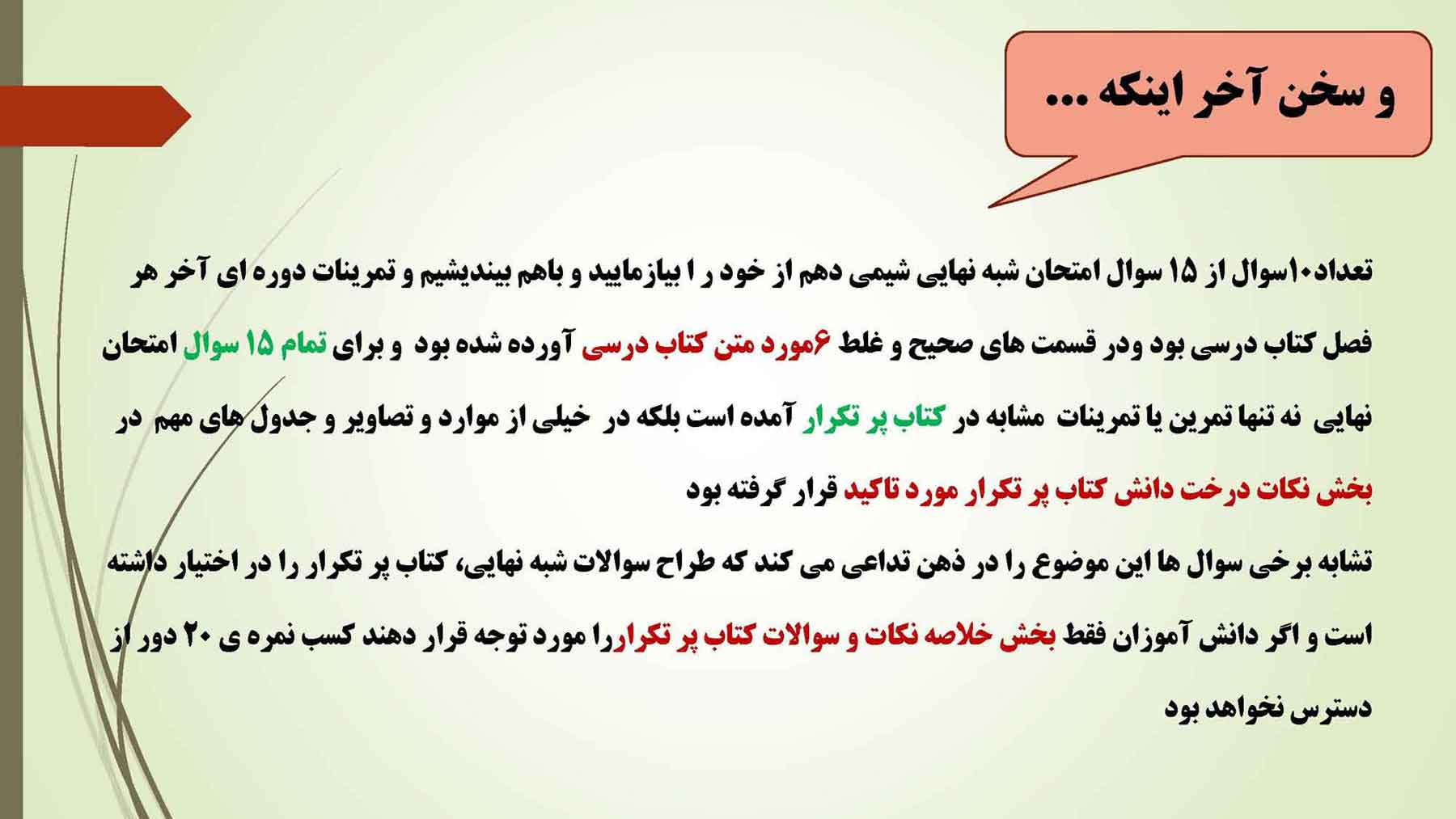 طبق بررسی ایشان،تمامی سؤالات امتحان نمونههای مشابهی در کتاب پرتکرار دارند که دور از انتظار نیست چرا که سؤالات این کتابها منتخب امتحانات برگزار شده در سراسر کشور است که بیشترین تکرار را داشته یعنی دبیران بیشتری این سؤالات را در امتحانات خود مطرح کردهاند.