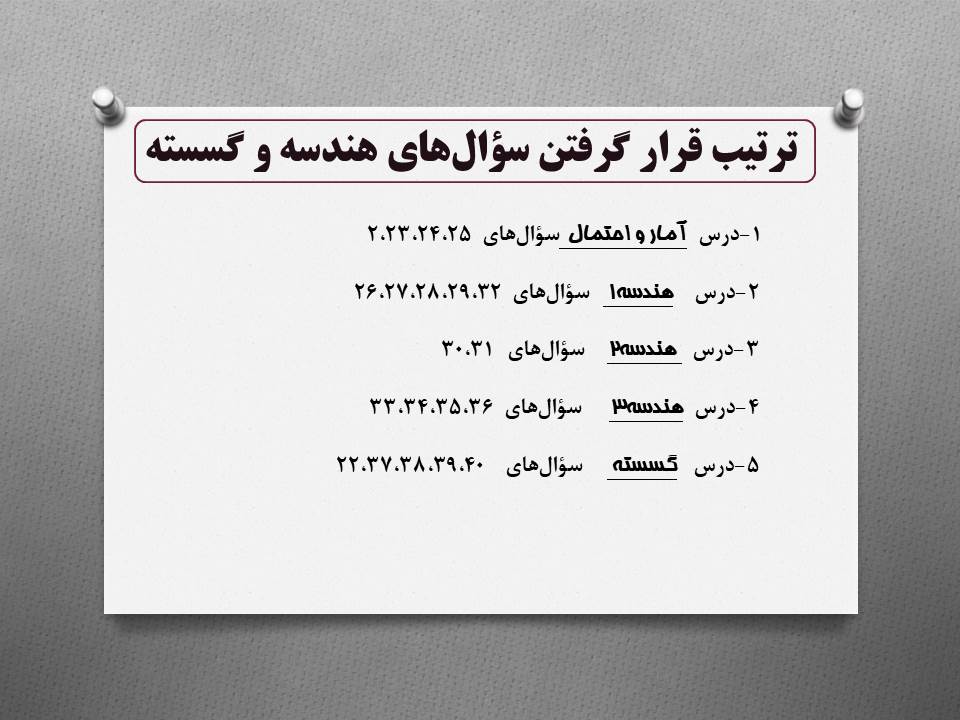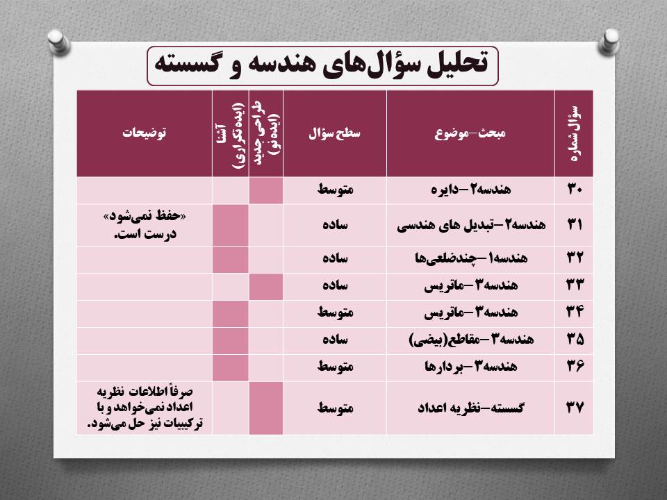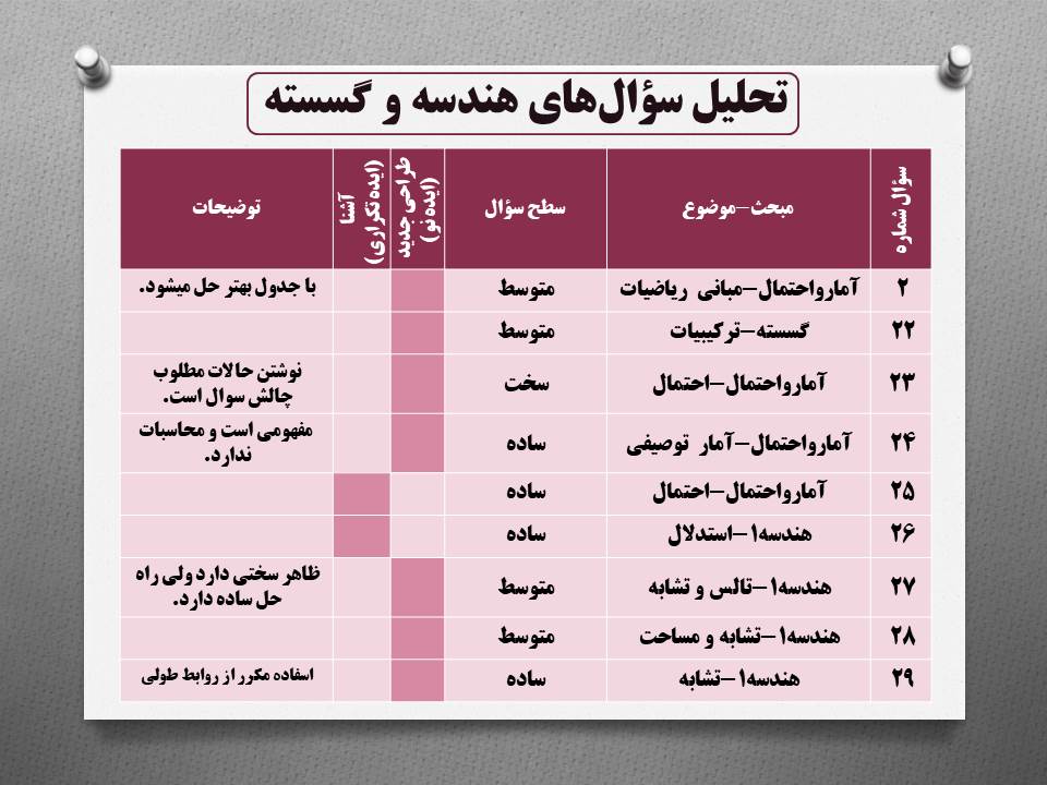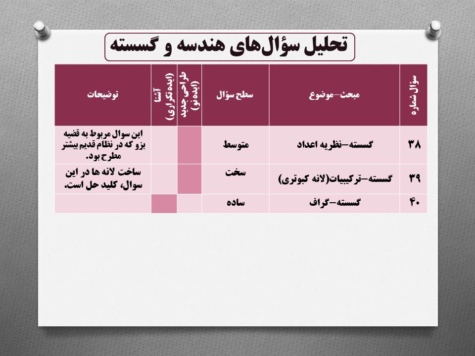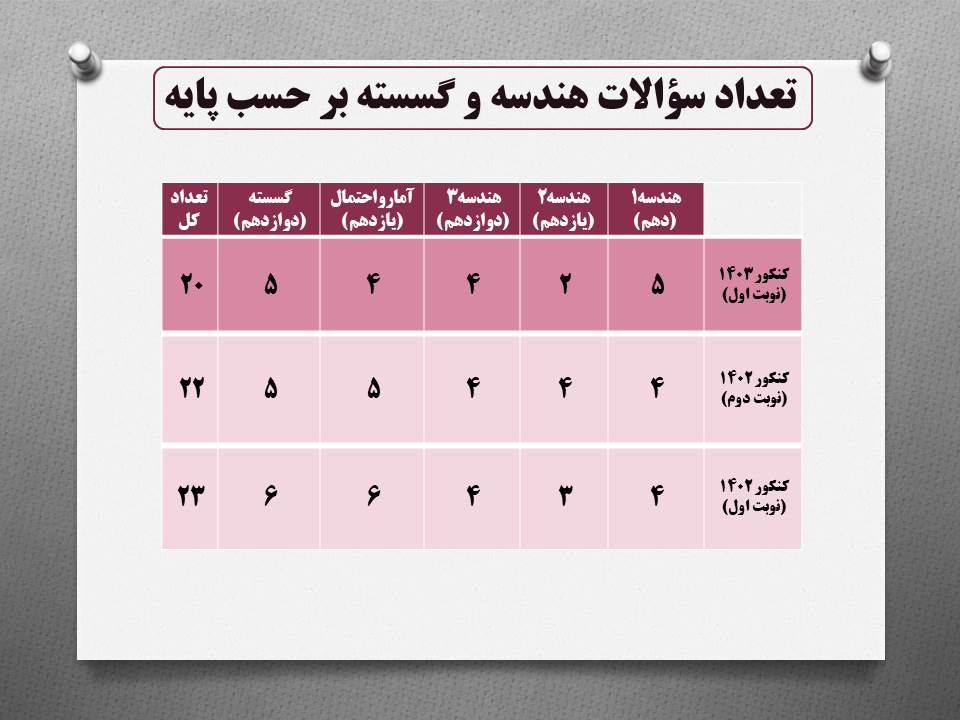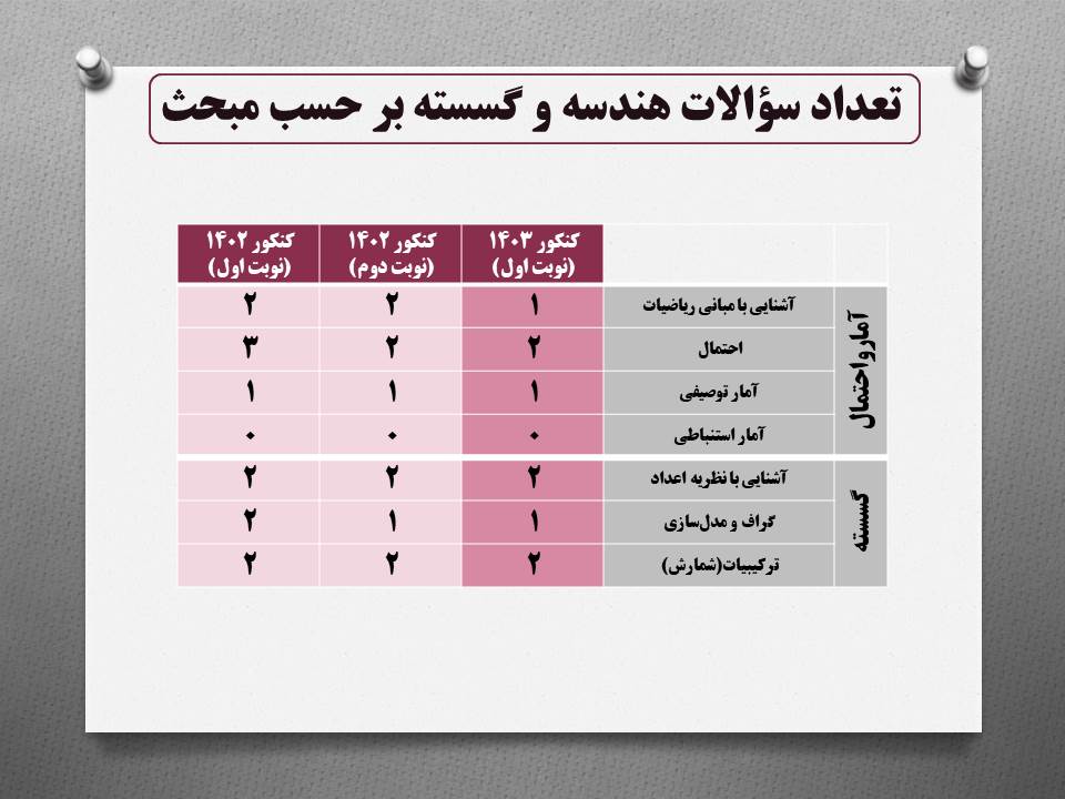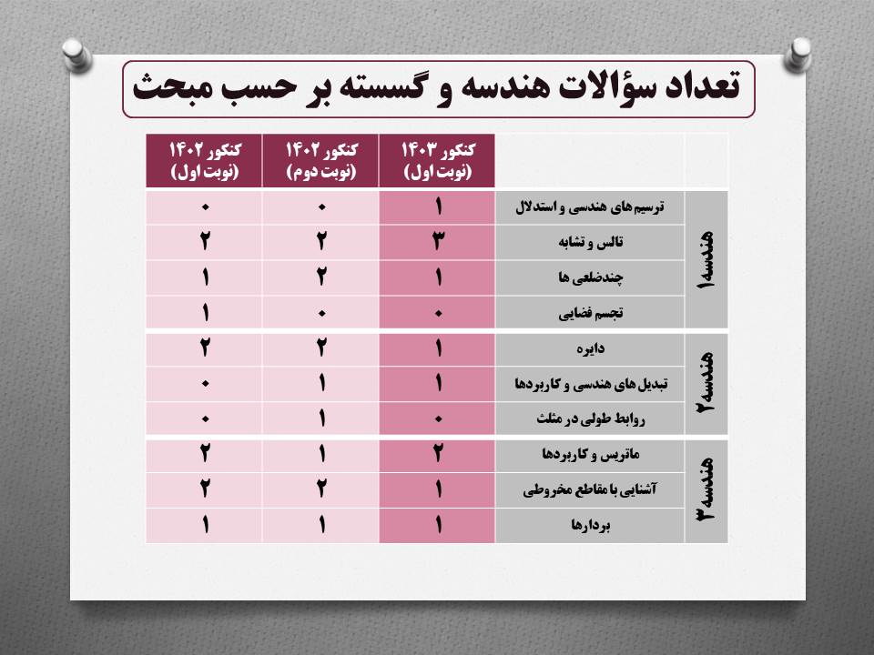 در تصاویر زیر رویکردهای درس هندسه و گسسته در کنکور ریاضی اردیبهشت 1403 (نوبت اول) و همچنین مقایسه آن با کنکورهای نوبت اول و دوم سال 1402 را آورده ایم.