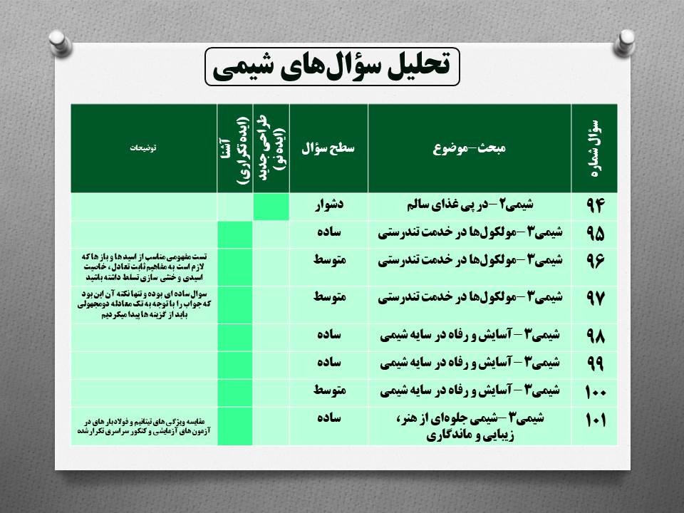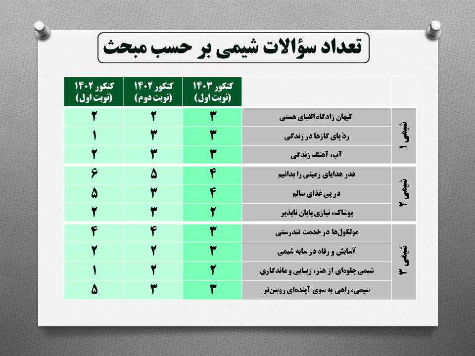 در تصاویر زیر رویکردهای درس شیمی در کنکور ریاضی اردیبهشت 1403 (نوبت اول) و همچنین مقایسه آن با کنکورهای نوبت اول و دوم سال 1402 را آورده ایم.