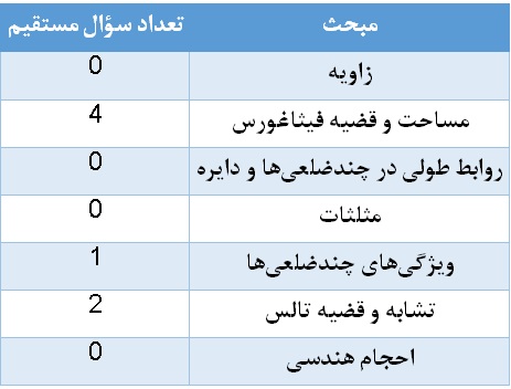 مهمترین نکته تعداد پایین سؤالات هندسه در مقایسه با سنوات اخیر است که فقط 7 سؤال هندسه در این کنکور به چشم میخورد.