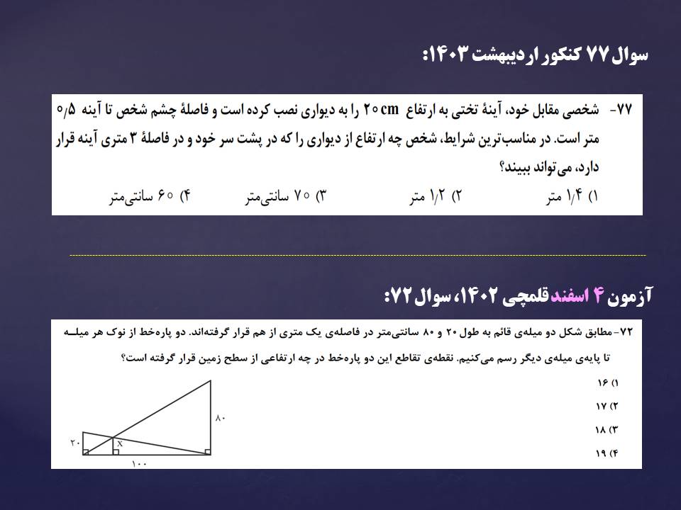 مشابهتهای درس درک عمومی ریاضی و فیزیک کنکور سراسری اردیبهشت 1403 با آزمونهای سال تحصیلی 1402 و 1403 کانون را در 15 سوال (نیمی از سوالات کنکور) مشاهده کنید. در این فایل صرفا مشابهت سوالها در نظر گرفته شده و مشابهتهای دفترچهی پاسخ تشریحی آورده نشده است. در حالی که دقت کنید منظور از مشابهت، سوالهای عیناً مطابق میان آزمونها با کنکور نیست؛ بلکه سوالاتی هستند که اگر در صورت سوال هم عیناً مطابق نباشند، ممکن است در تحلیل شکل یا تحلیل پاسخ آنها به نکات نزدیک و مشابه دست پیدا کنید و تحلیل همین سوالهای آزمون، برای پاسخگویی به 15 تا از سوالات کنکور کفایت میکرده است.