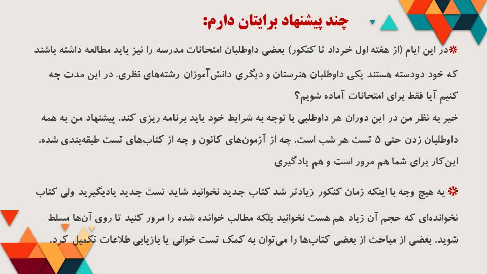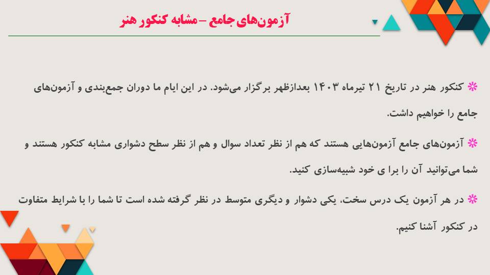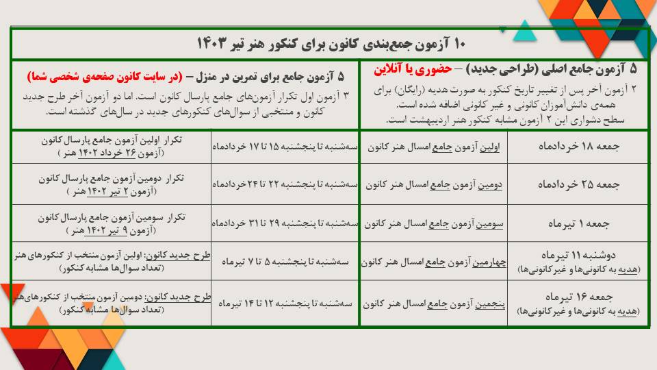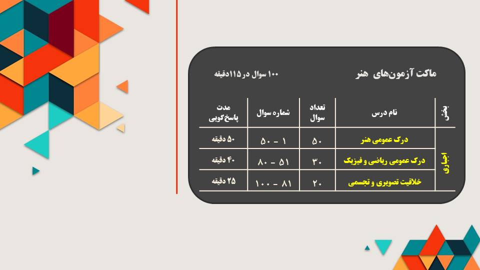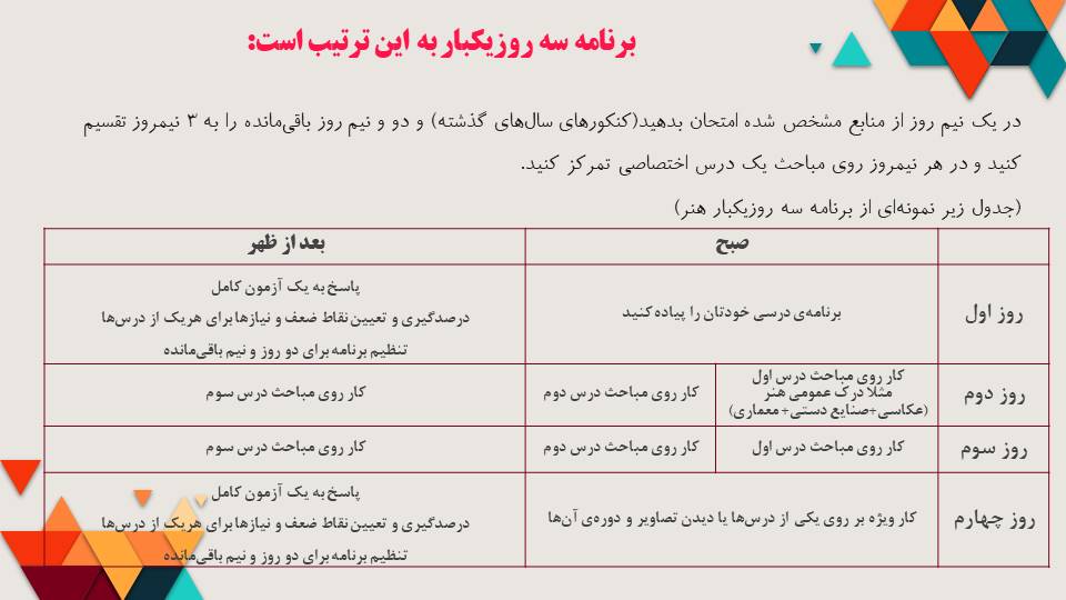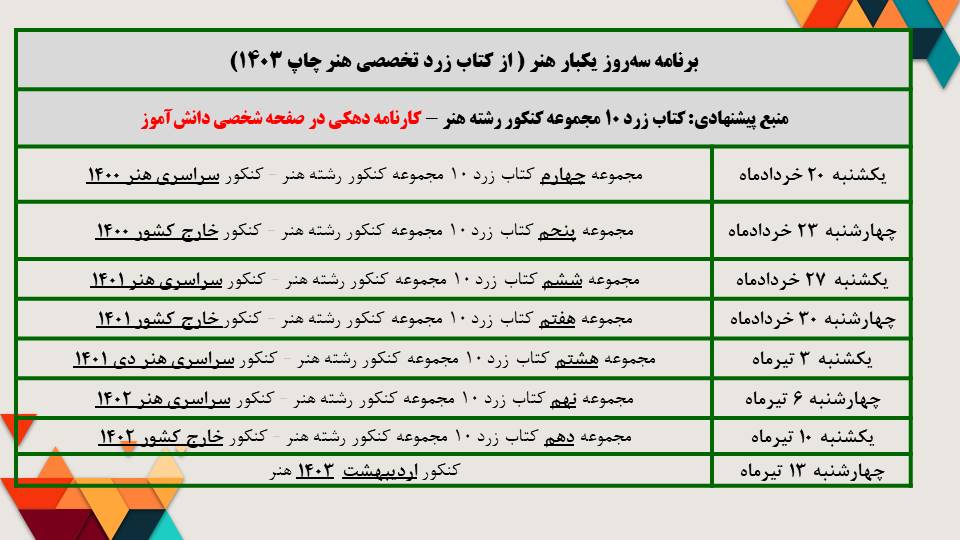 سلام دوستان و طرفداران کنکور هنربرنامه سهروز یکبار برای دوران جمعبندی کنکور هنر را با تفکیک آزمون:برنامه در یک نگاه