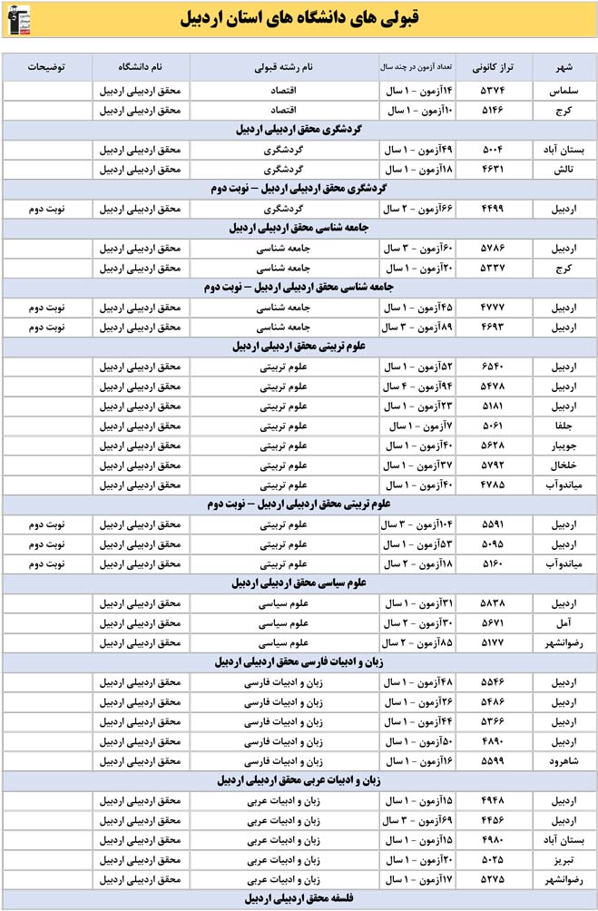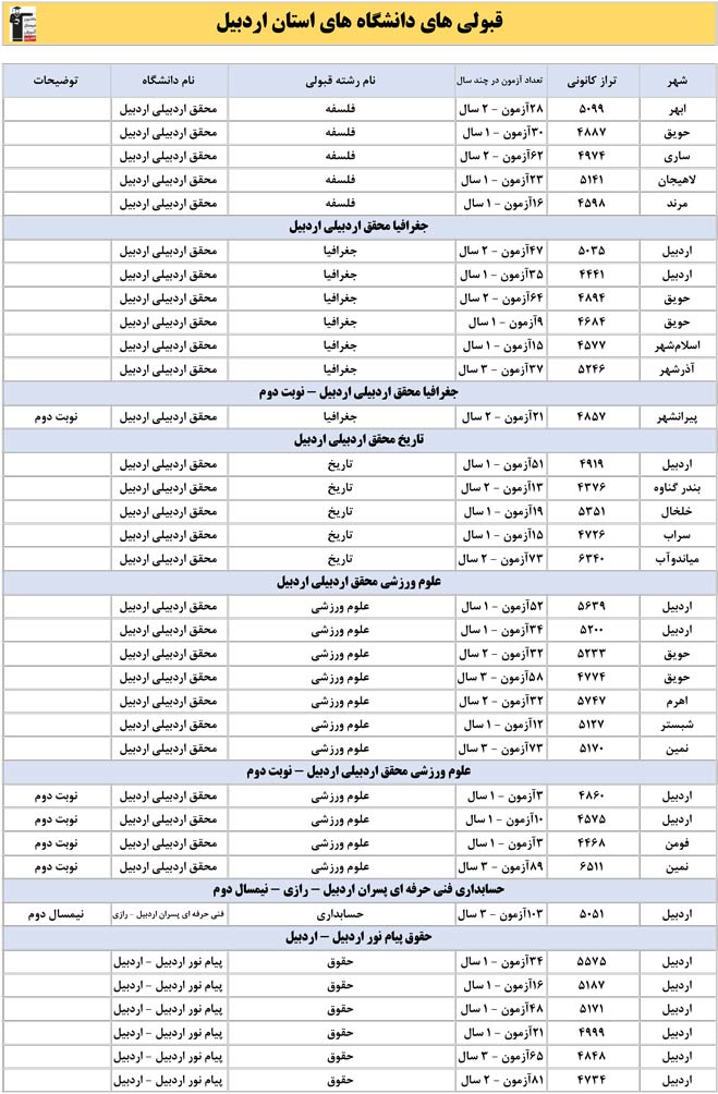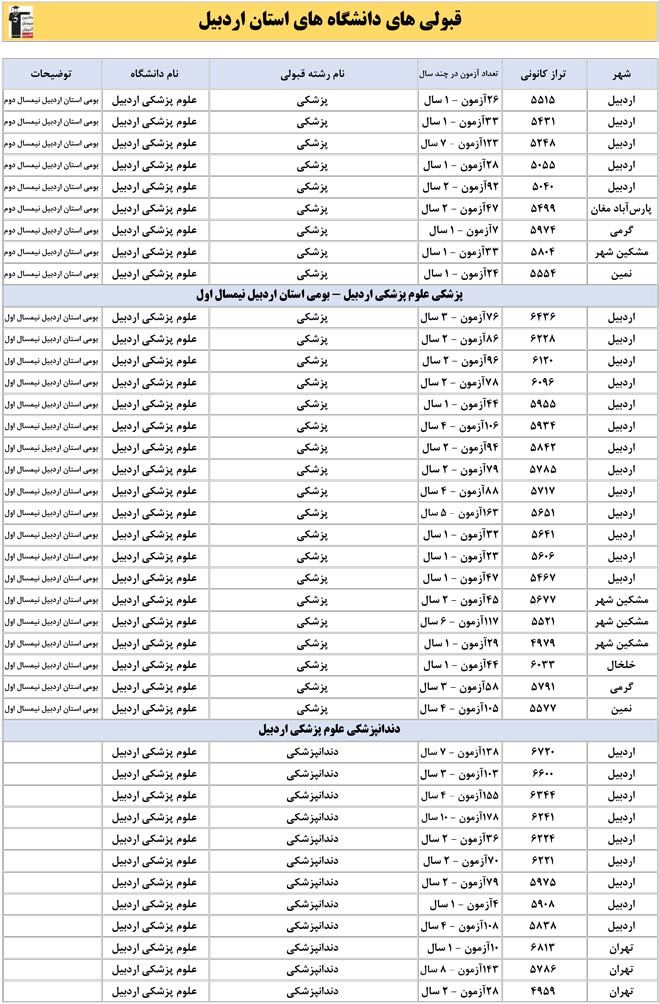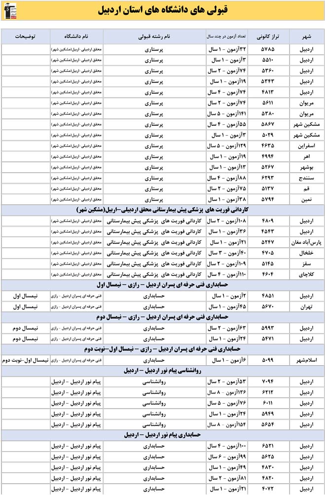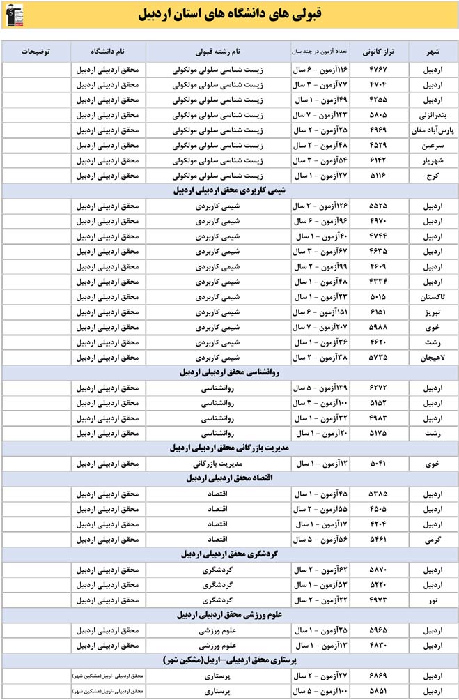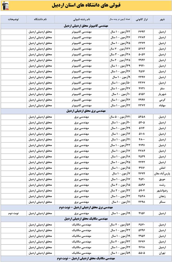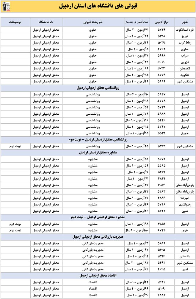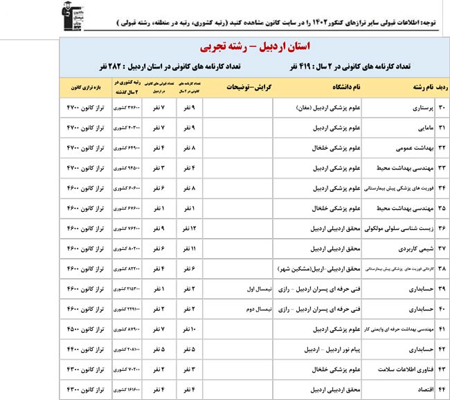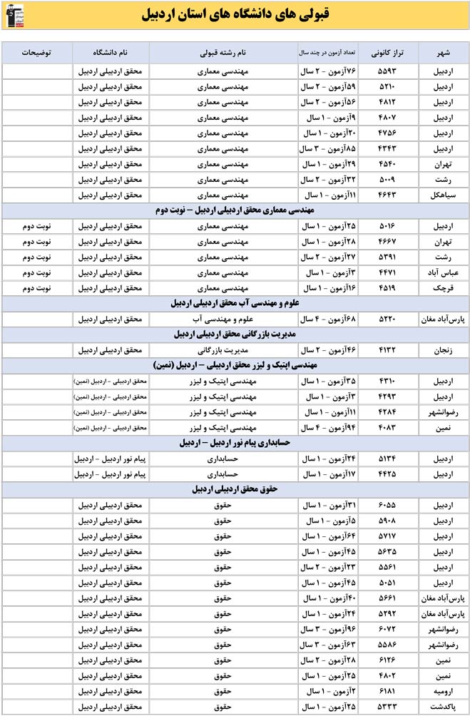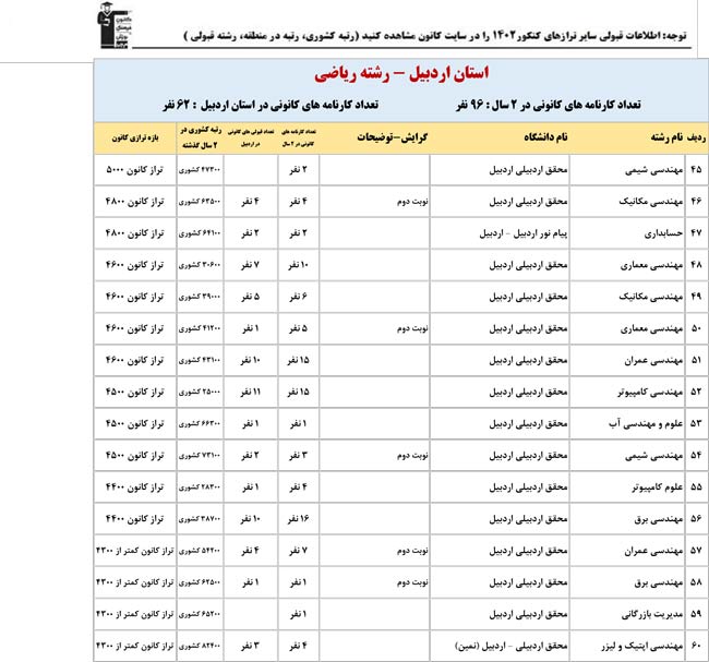 این آمار و اطلاعات مربوط به رشته های دانشگاه های استان اردبیل و دانش آموزان دو سال قبل کانون(کنکور1401 و 1402) می باشد .شما می توانید نمره ی تراز خود را پیدا کنید و متوجه شوید ، آن ها که پارسال ترازشان مثل شما بوده چه رشته هایی قبول شدند.