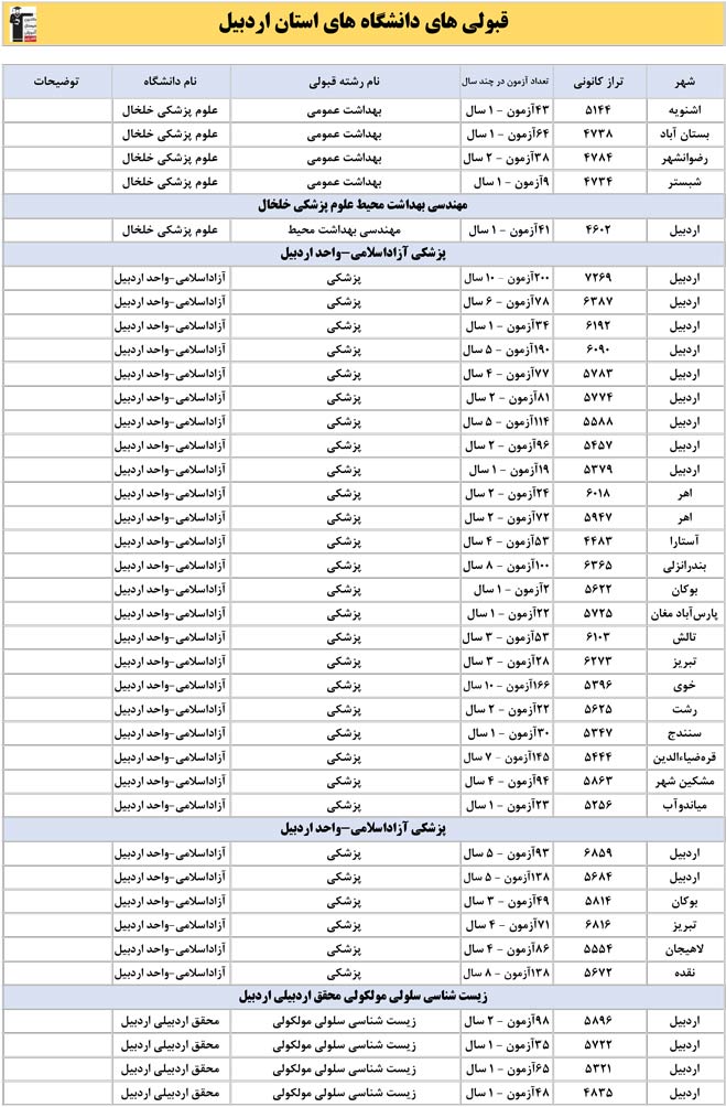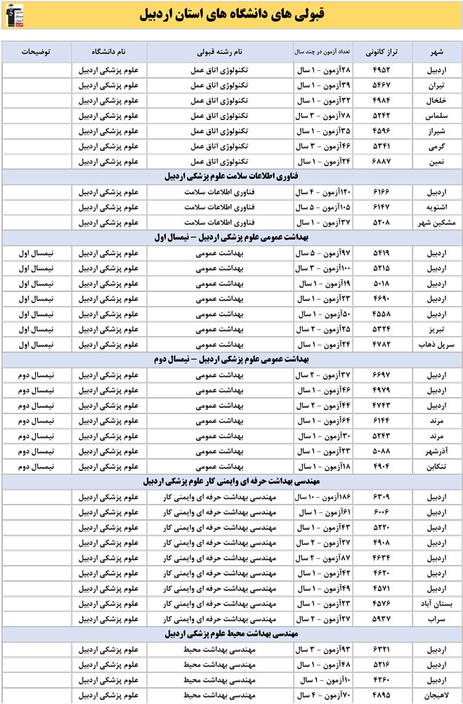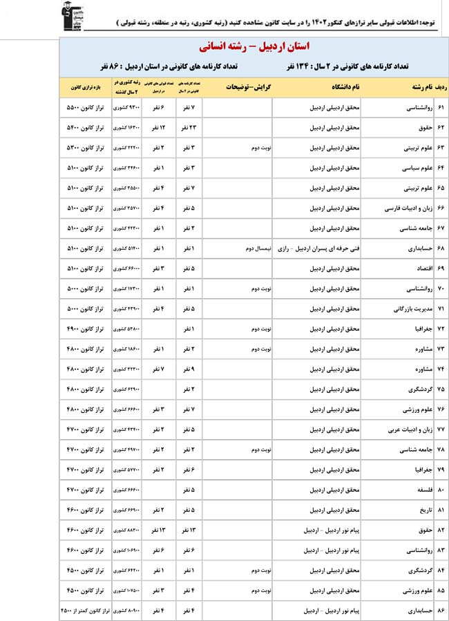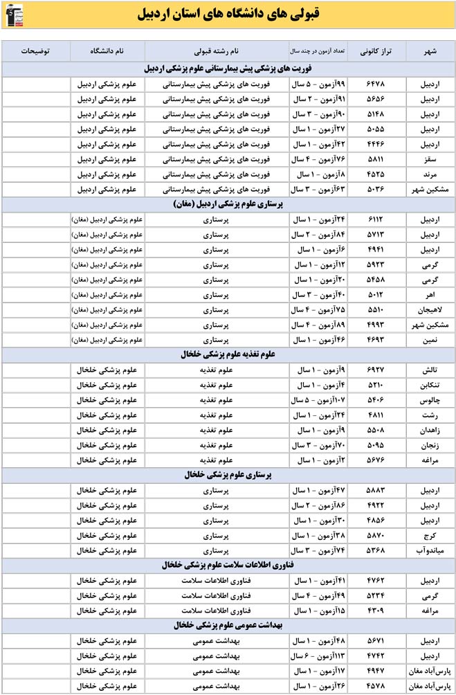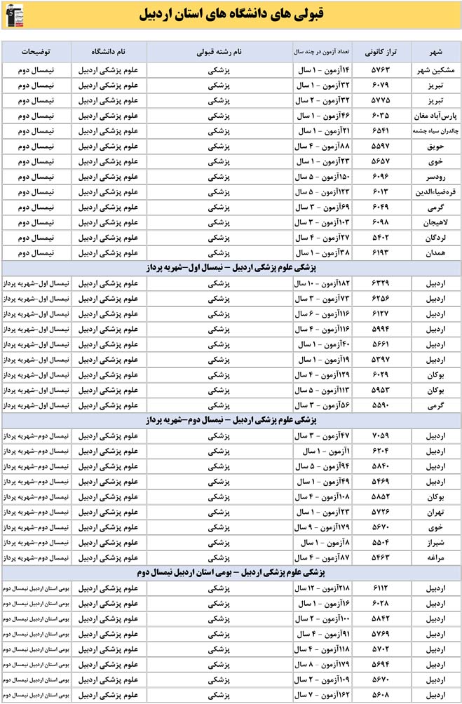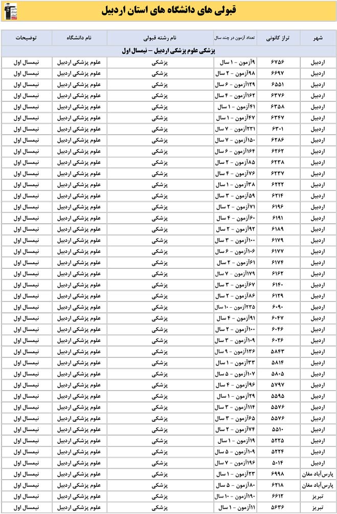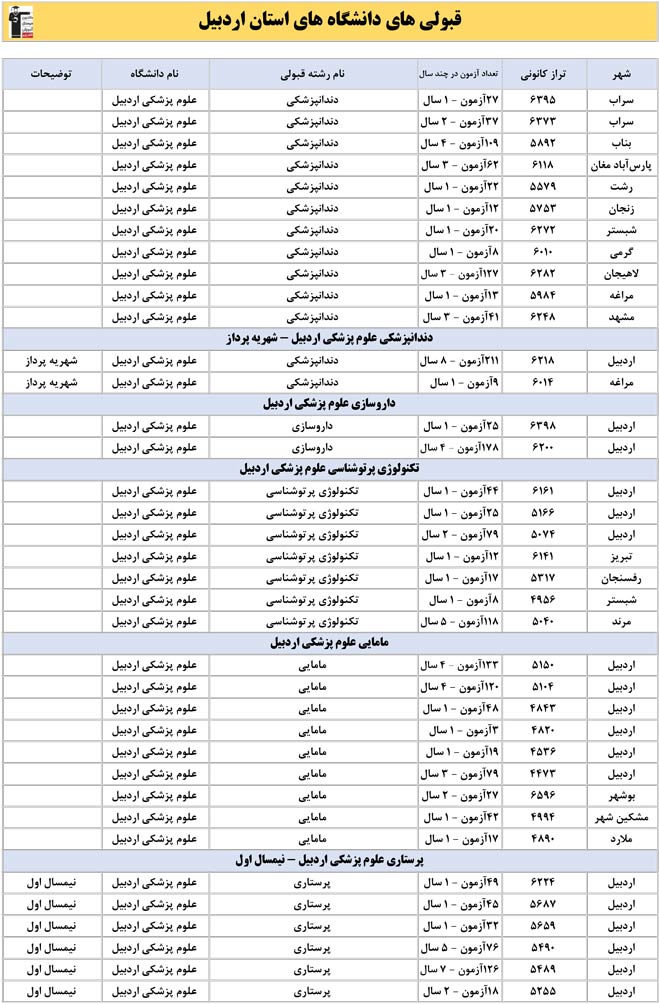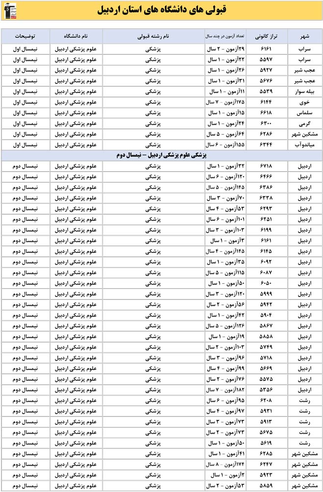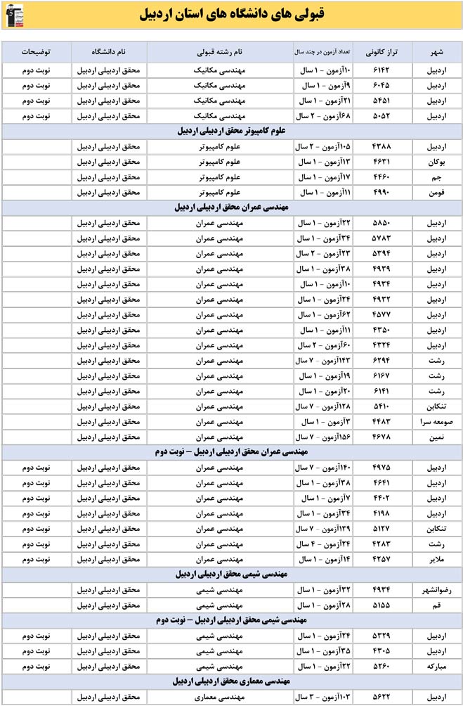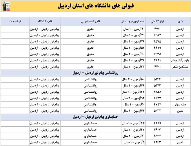 این آمار و اطلاعات مربوط به رشته های دانشگاه های استان اردبیل و دانش آموزان دو سال قبل کانون(کنکور1401 و 1402) می باشد .شما می توانید نمره ی تراز خود را پیدا کنید و متوجه شوید ، آن ها که پارسال ترازشان مثل شما بوده چه رشته هایی قبول شدند.