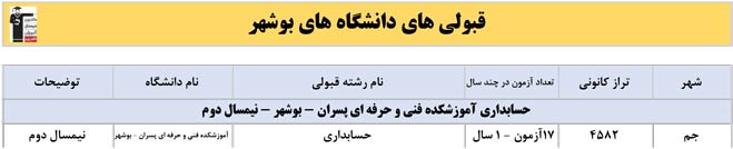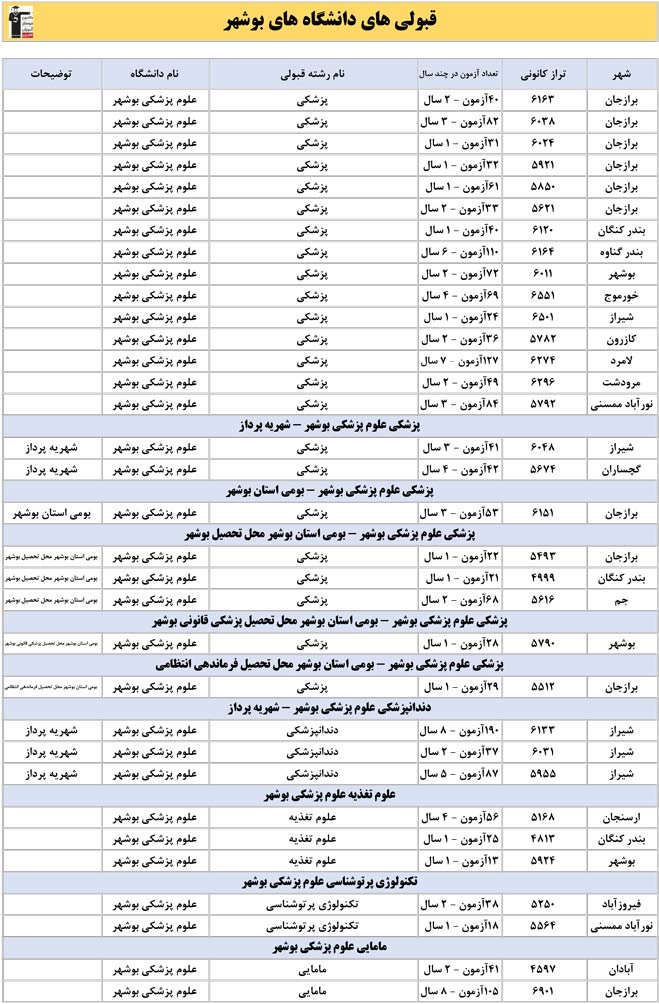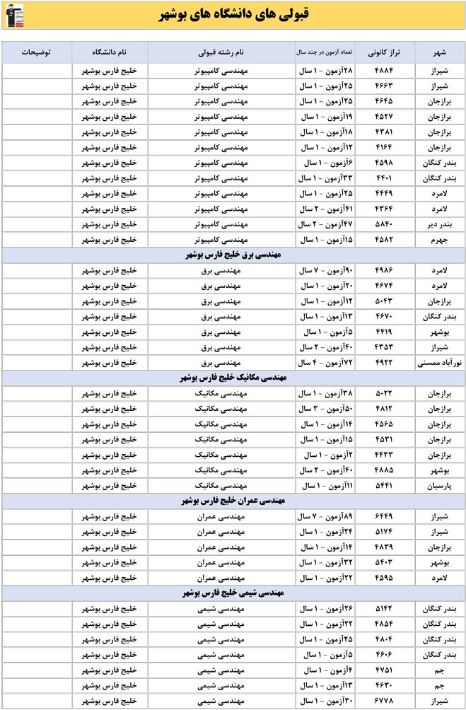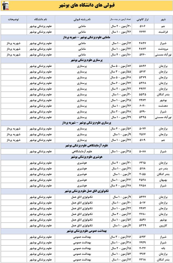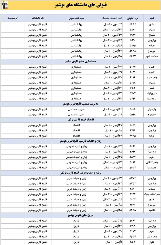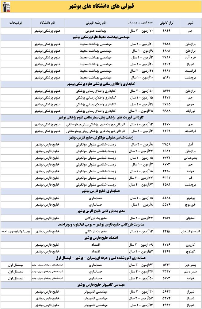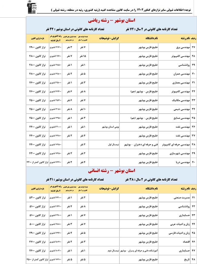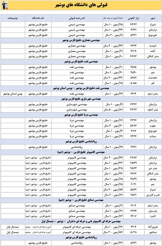 این آمار و اطلاعات مربوط به رشته های دانشگاه های استان بوشهر و دانش آموزان دو سال قبل کانون(کنکور1401 و 1402) می باشد .شما می توانید نمره ی تراز خود را پیدا کنید و متوجه شوید ، آن ها که پارسال ترازشان مثل شما بوده چه رشته هایی قبول شدند.