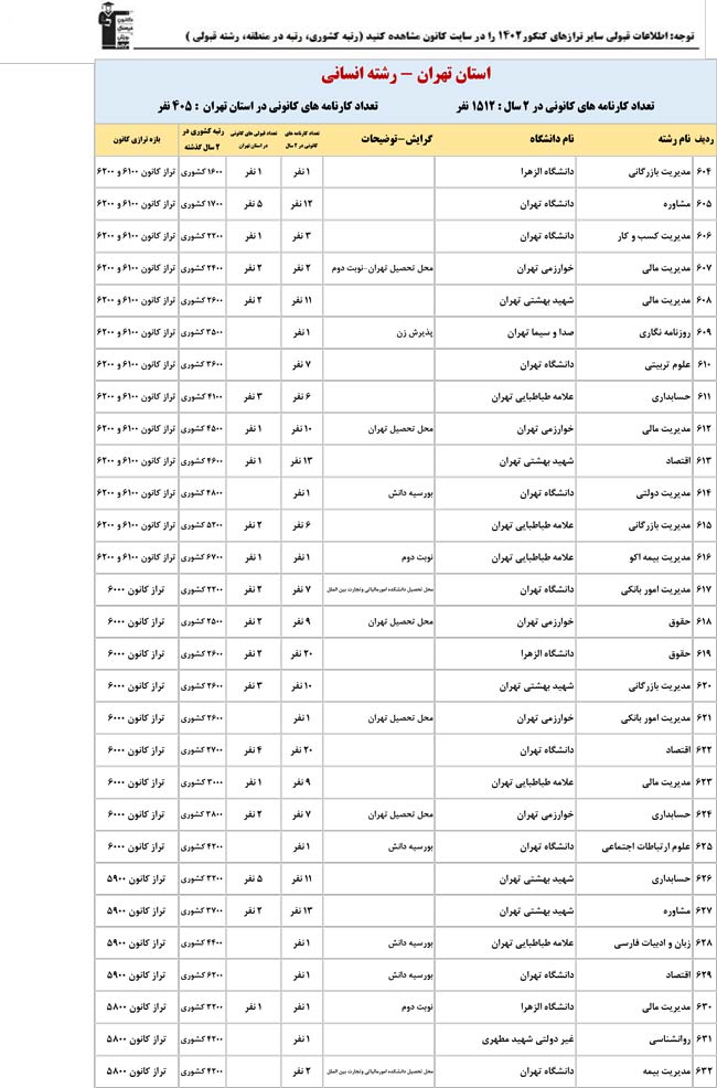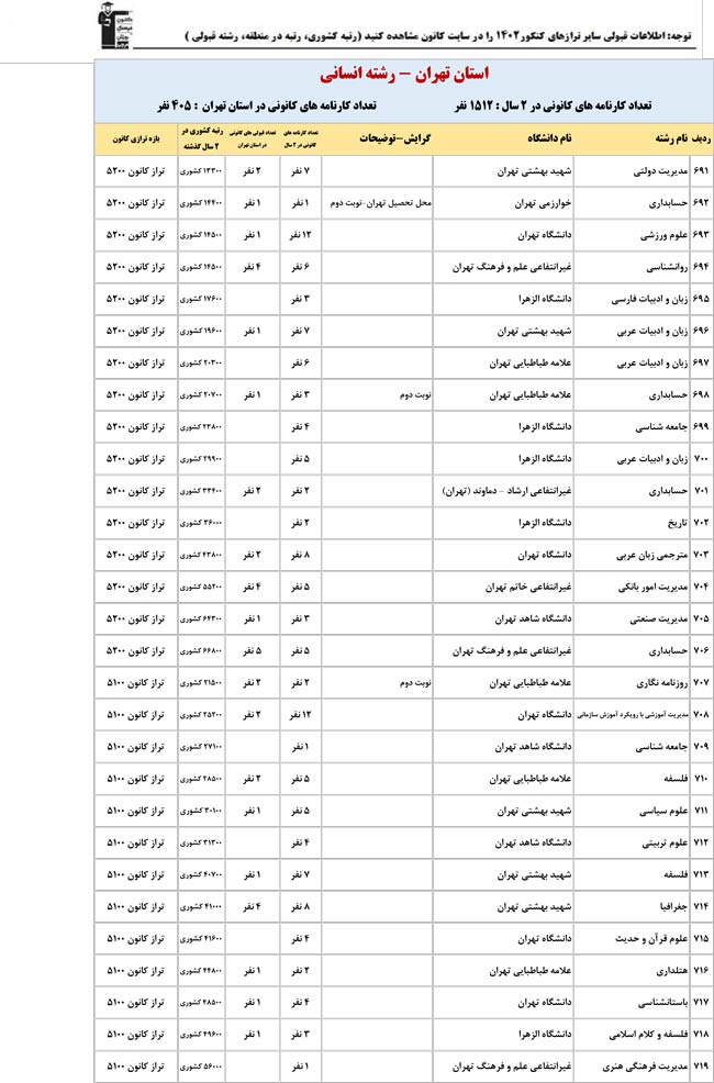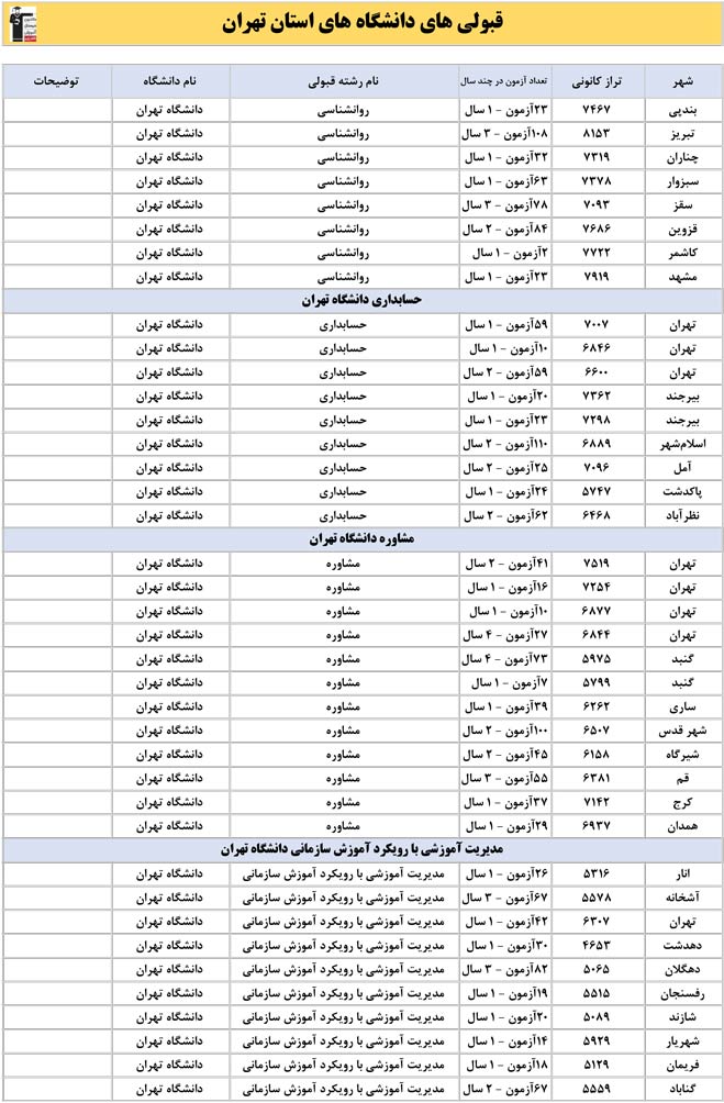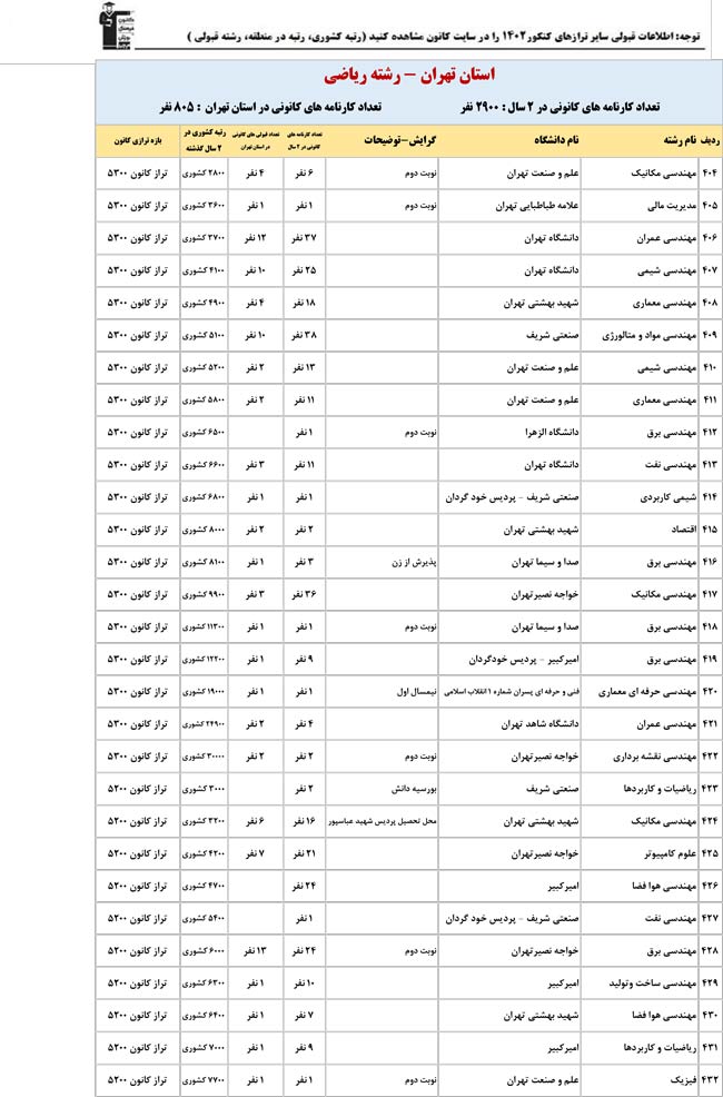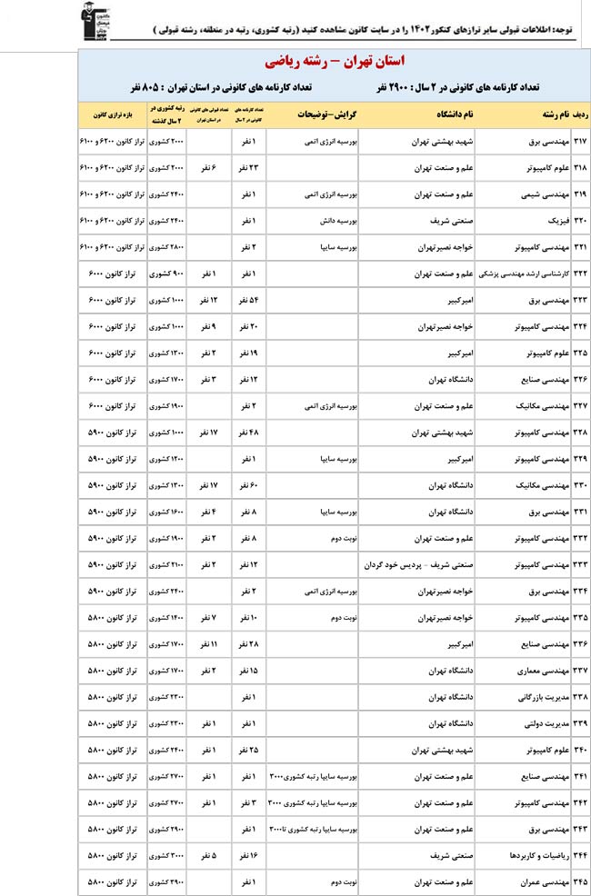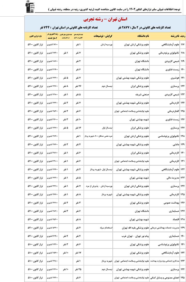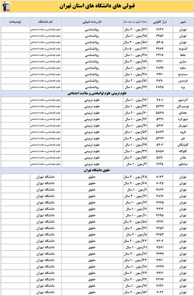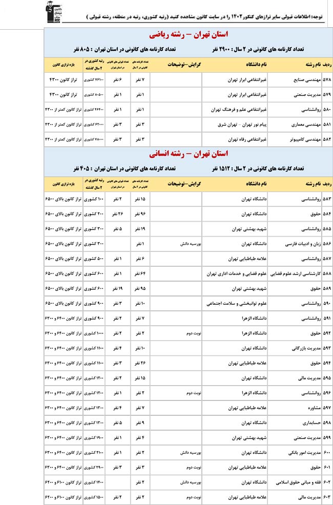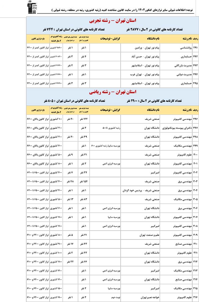 این آمار و اطلاعات مربوط به رشته های دانشگاه های استان تهران و دانش آموزان دو سال قبل کانون(کنکور1401 و 1402) می باشد .شما می توانید نمره ی تراز خود را پیدا کنید و متوجه شوید ، آن ها که پارسال ترازشان مثل شما بوده چه رشته هایی قبول شدند.